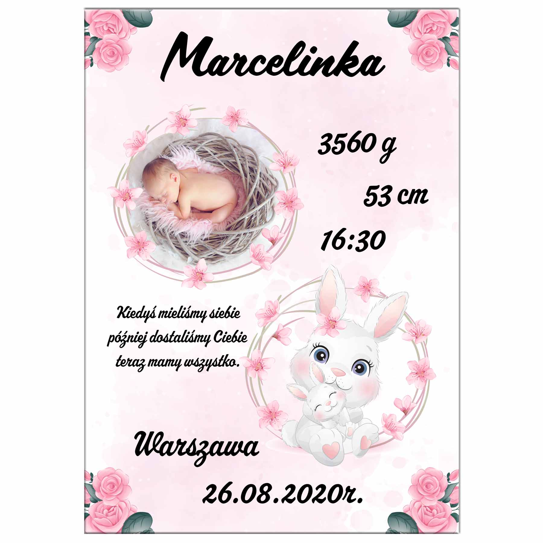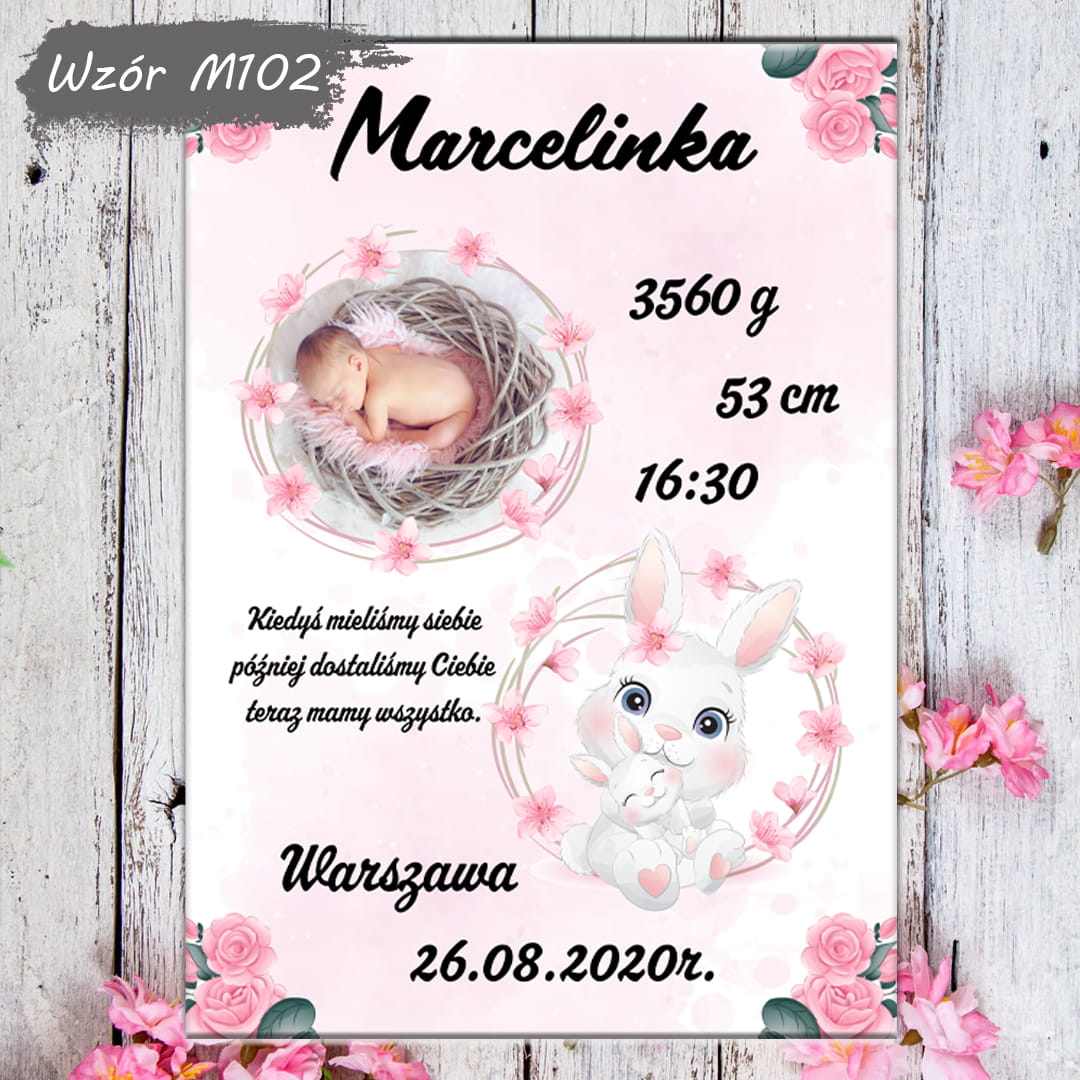 Metryczka dla dziewczynki ze zdjęciem - różowy króliczek