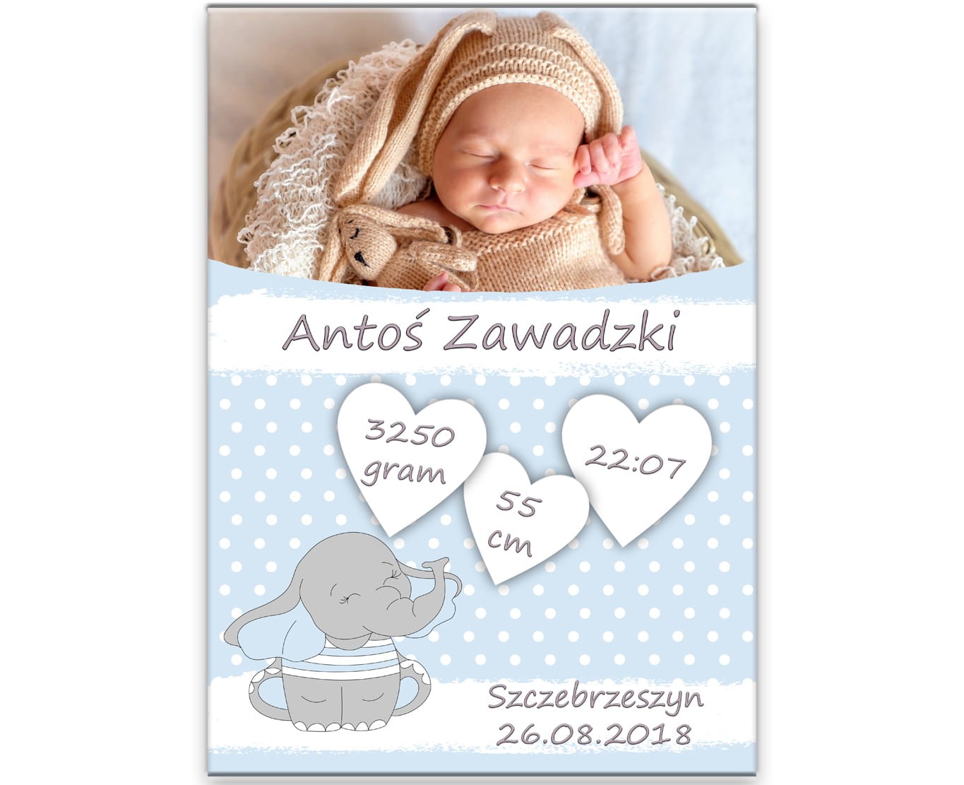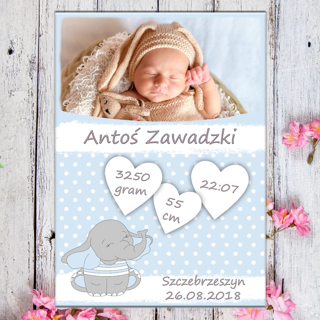 Metryczka ze zdjęciem - niebieski słonik