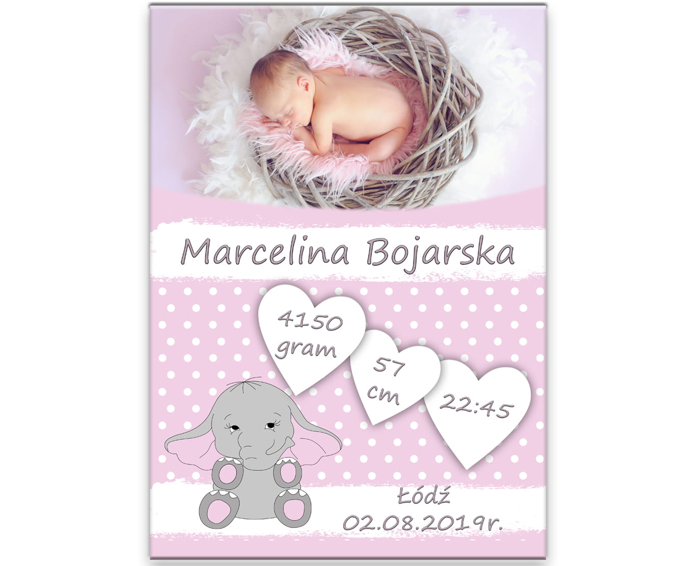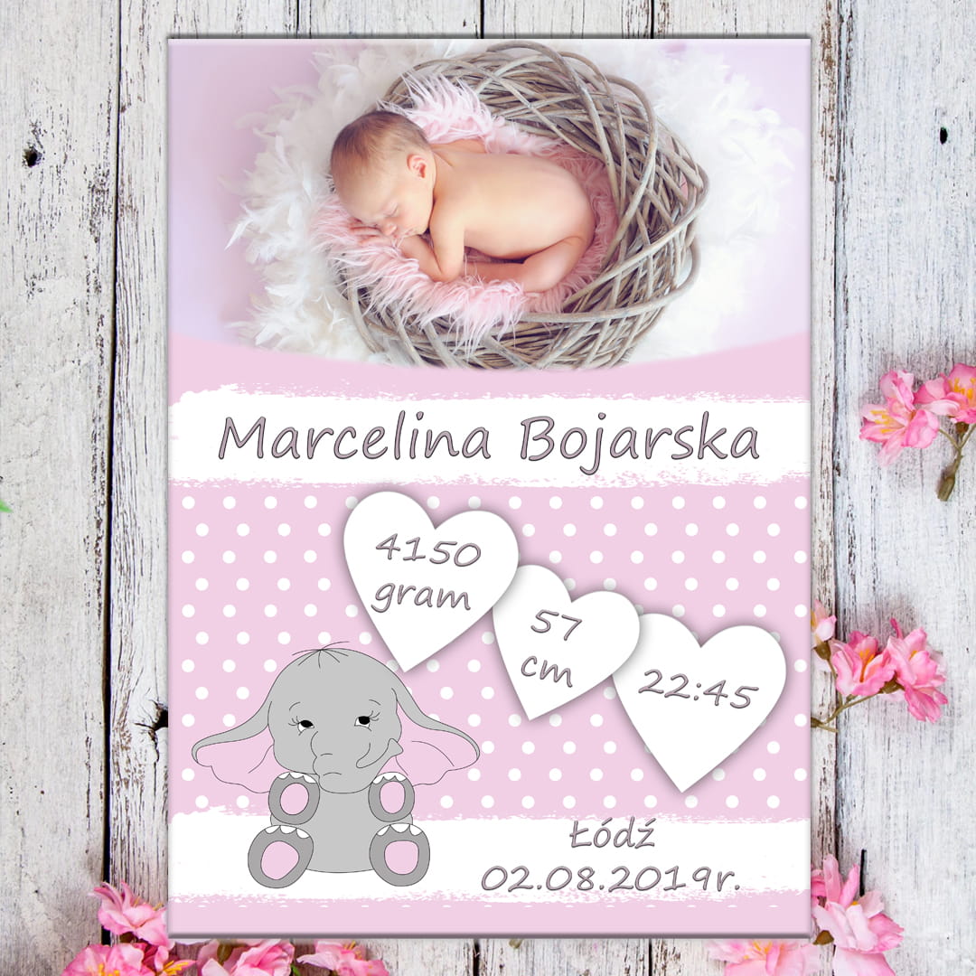 Metryczka ze zdjęciem - różowy słonik