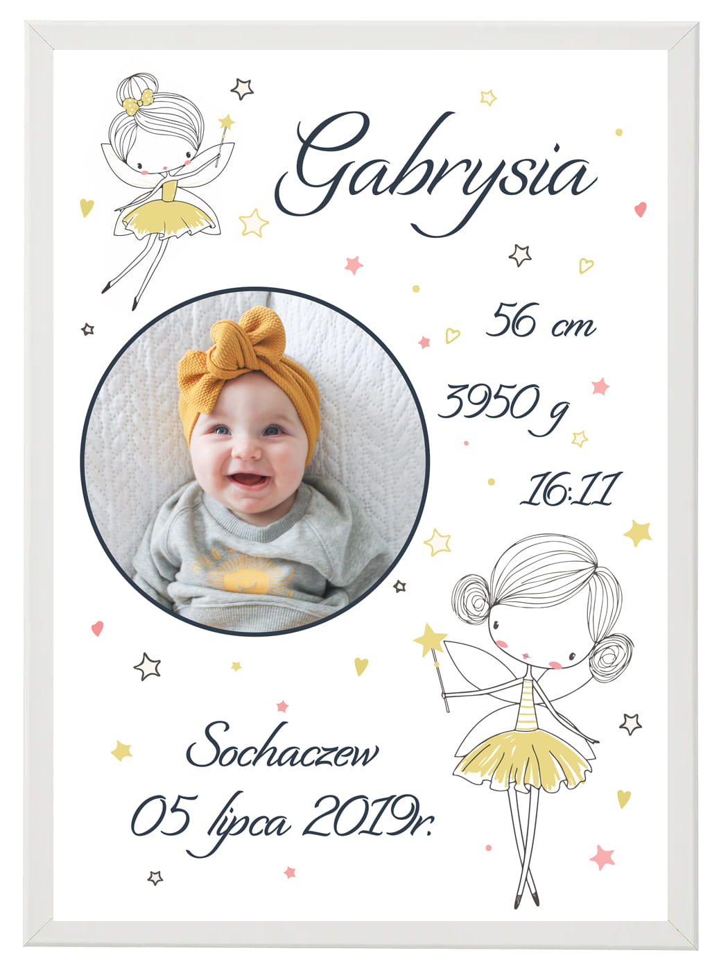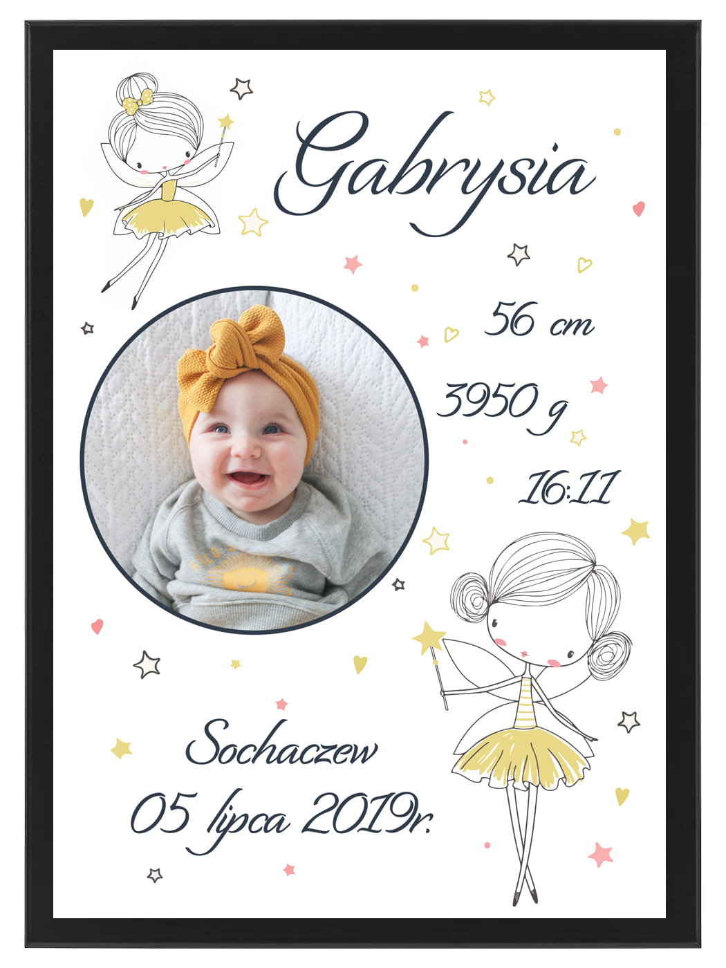 Zapraszamy do wyboru imiennej foto-metryczki w formacie A4 (21x29,7cm) w ramce do wyboru (ramki z ochronna plexi, zabezpieczone folią z możliwością postawienia jak i powieszenia). Plakat drukowany jest na profesjonalnym papierze fotograficznym oraz oprawiony od razu w ramkę. Informację zawarte na wzorach są przykładowe i można je dowolnie modyfikować - usługa jest bezpłatna!