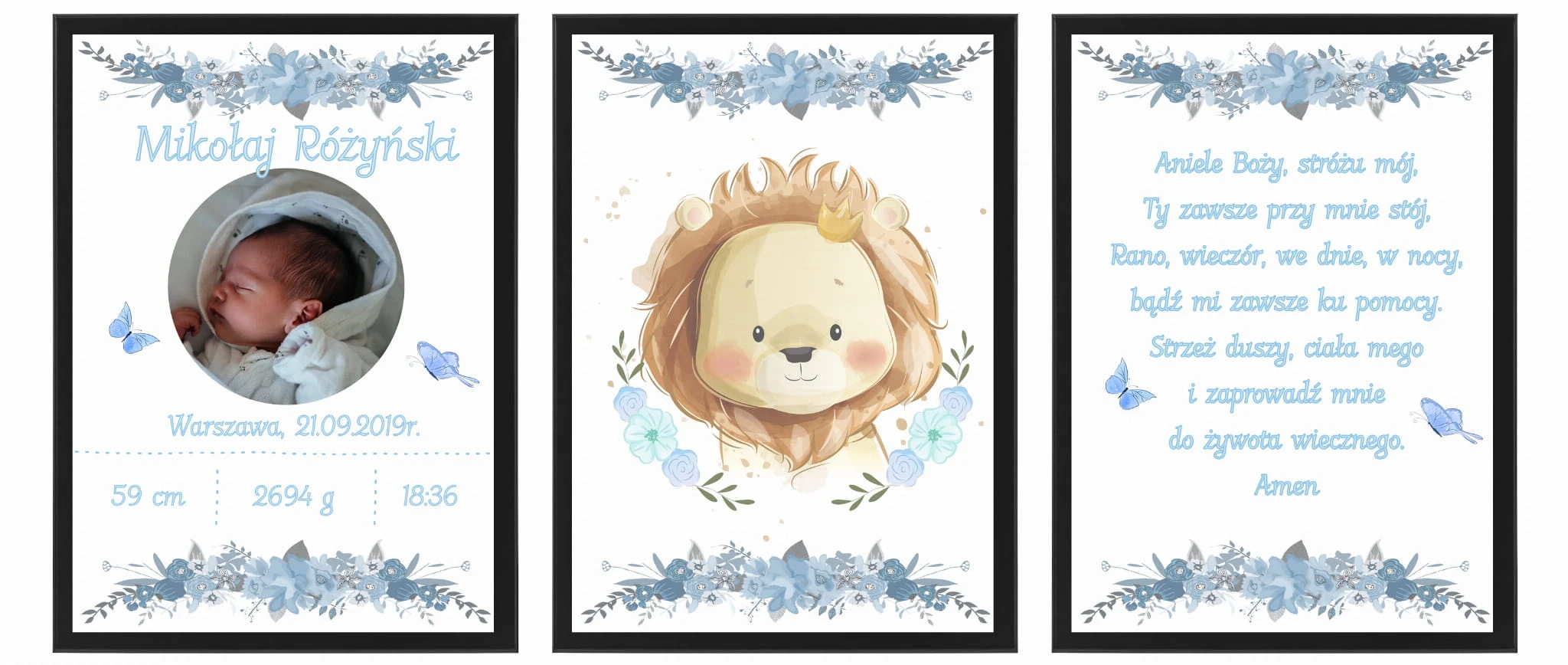 Zapraszamy do wyboru imiennej metryczki w formacie A4 (21x29,7cm) w ramce do wyboru (ramki z ochronna plexi, zabezpieczone folią z możliwością postawienia jak i powieszenia). Plakat drukowany jest na profesjonalnym papierze fotograficznym oraz oprawiony od razu w ramkę. Informację zawarte na wzorach są przykładowe i można je dowolnie modyfikować - usługa jest bezpłatna!