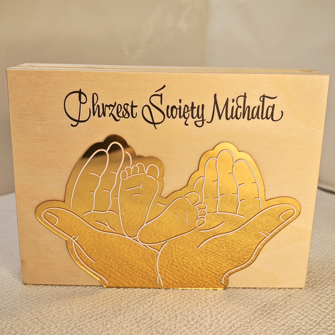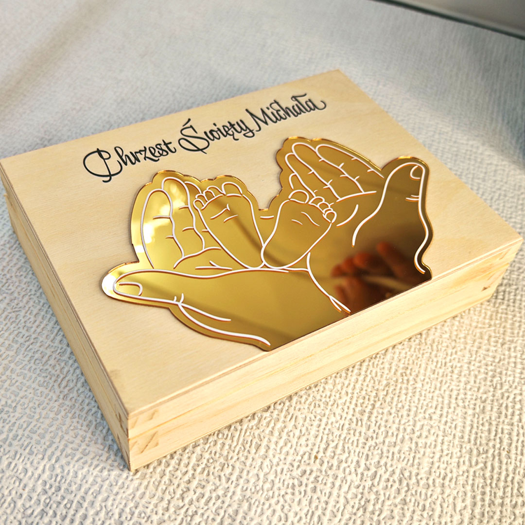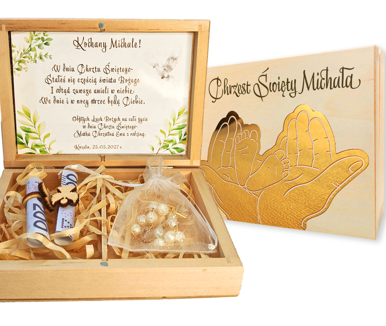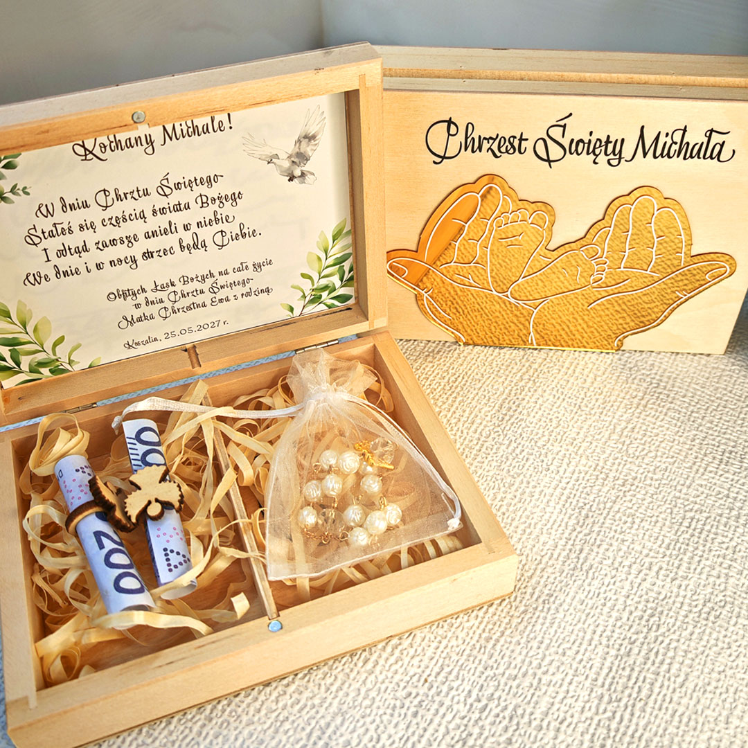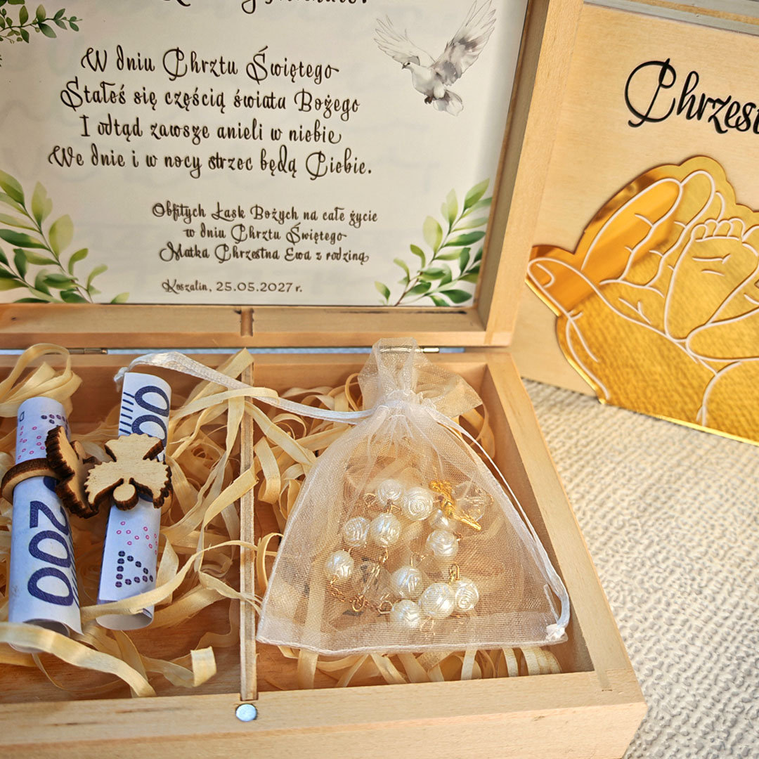 Pamiątka Chrztu Świętego w formie pudełeczka z dziesiątką różańca oraz trzema "aniołkami" na pieniądze. W górnej części pudełka znajduję się wklejka z życzeniami oraz personalizacją. Dolna część pudełka wypełniona jest wełną drzewną. Na froncie pudełka znajduje się symbol "rączki i nóżki" ze złotej plexi lustro. Każda personalizacja jest przygotowana indywidualnie dla klienta. Pudełeczko może zostać świetnie wykorzystane jako pudełko na pieniądze z okazji Chrztu Świętego. Do każdego pudełeczka dodajemy trzy sztuki "aniołków z pierścionkiem" do umieszczenia pieniędzy. Banknoty nie są wyposażeniem pudełka. Istnieje możliwość umieszczenie własnego tekstu życzeń.