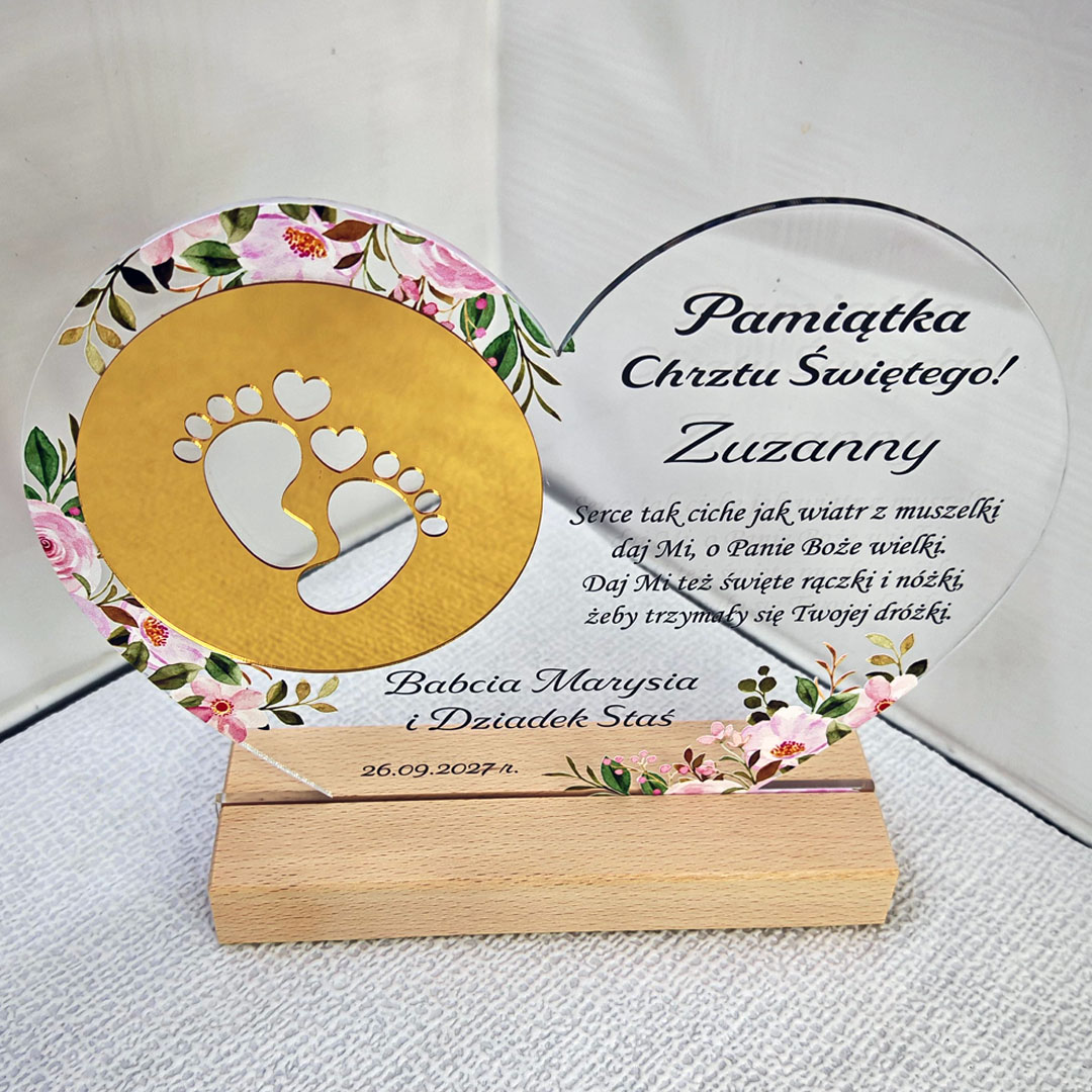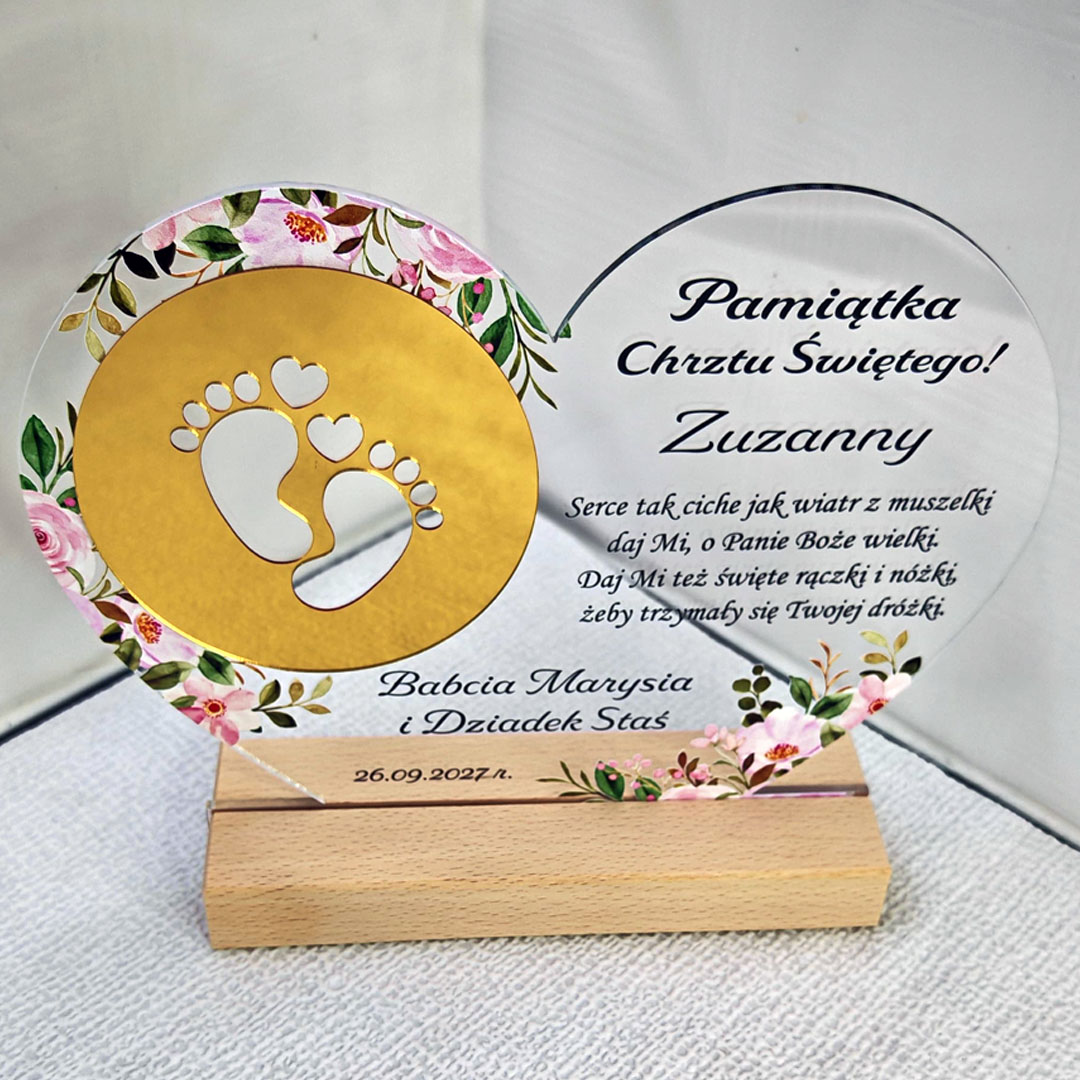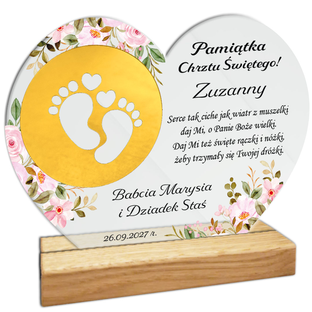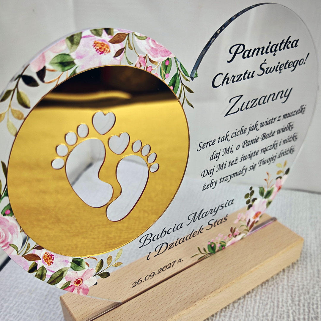Pamiątka Chrztu Świętego Prezent na chrzest na szkle akrylowym Serce Złote lustro