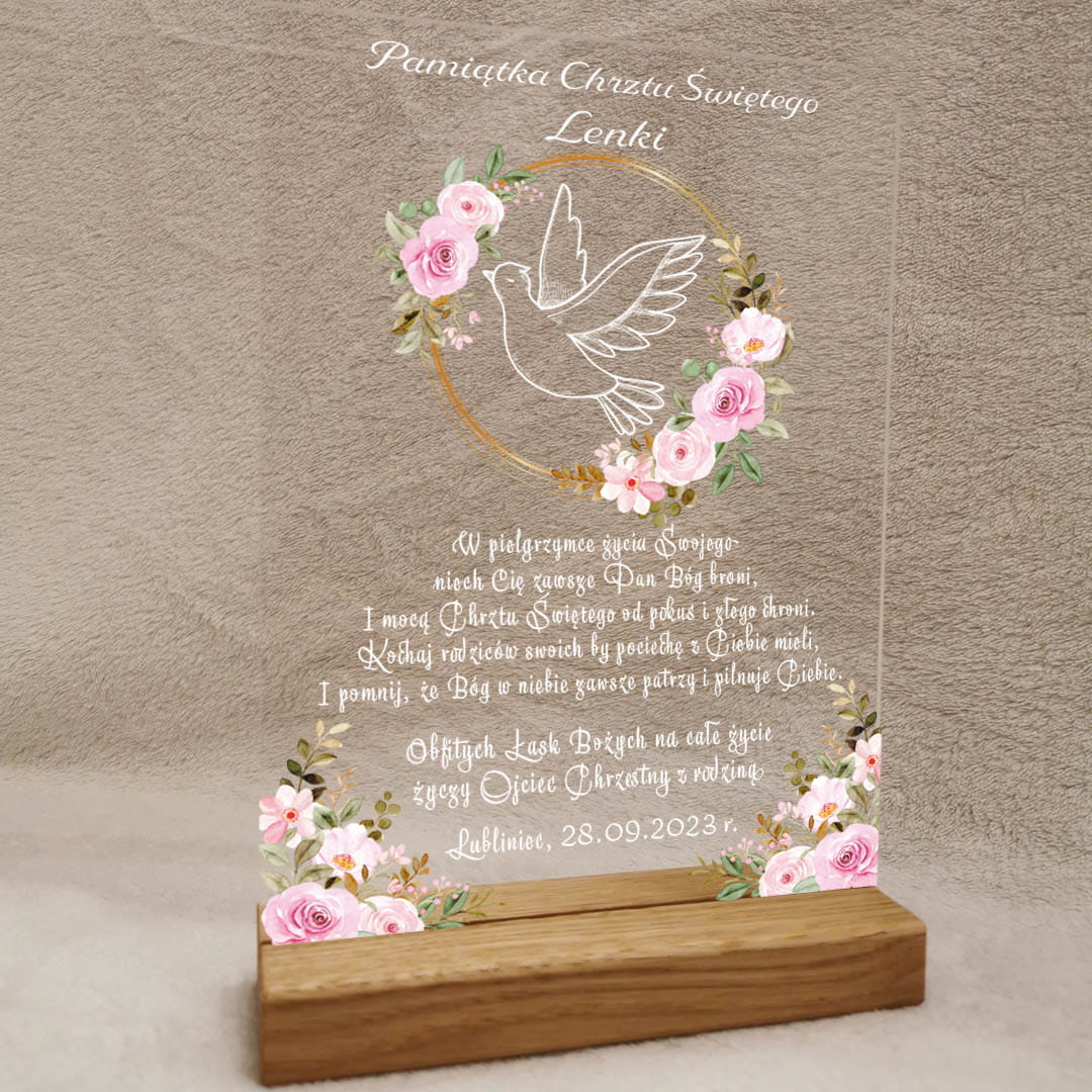 Pamiątka Chrztu Świętego Prezent na chrzest na szkle akrylowym róże