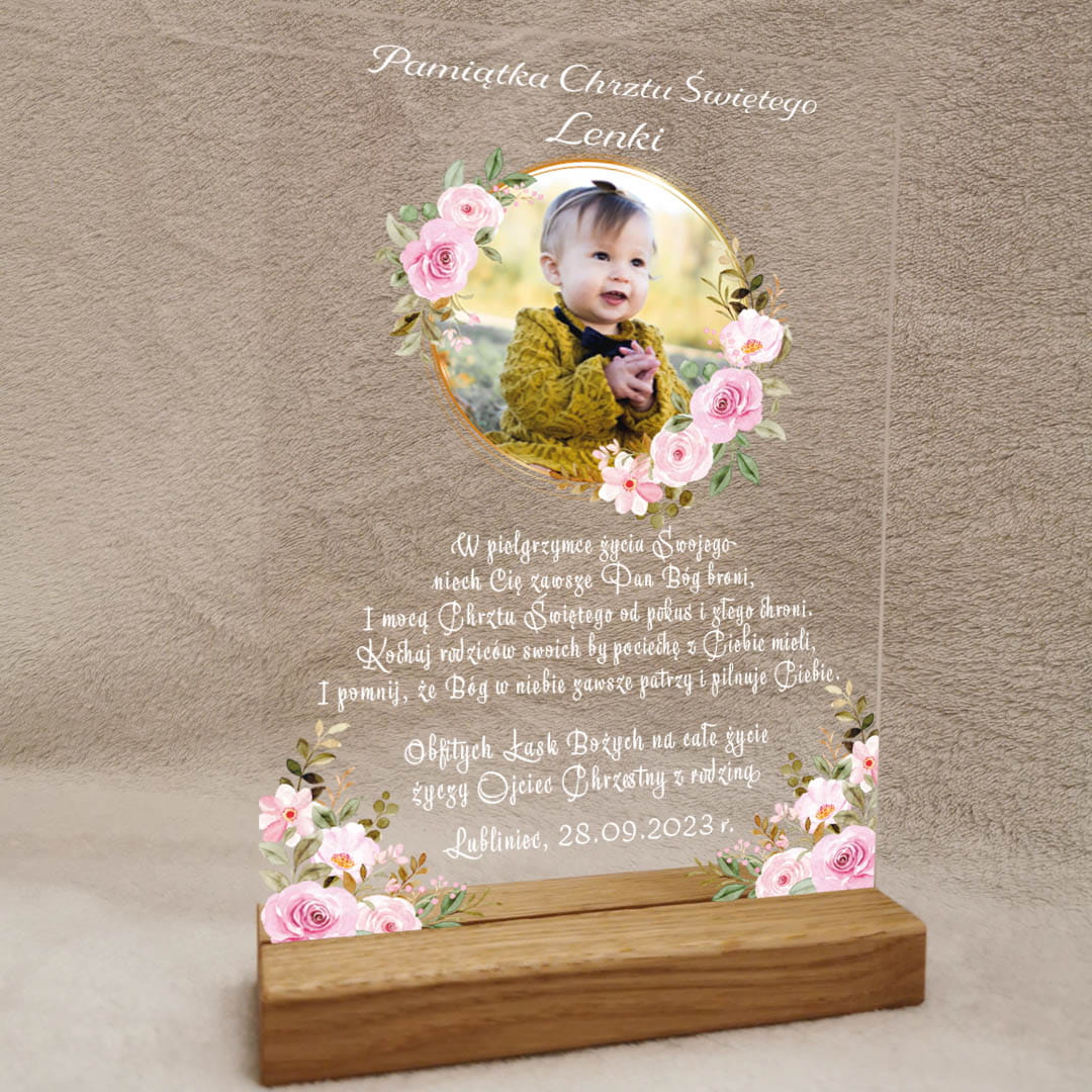 Pamiątka Chrztu Świętego Prezent na chrzest na szkle akrylowym ze zdjęciem róże