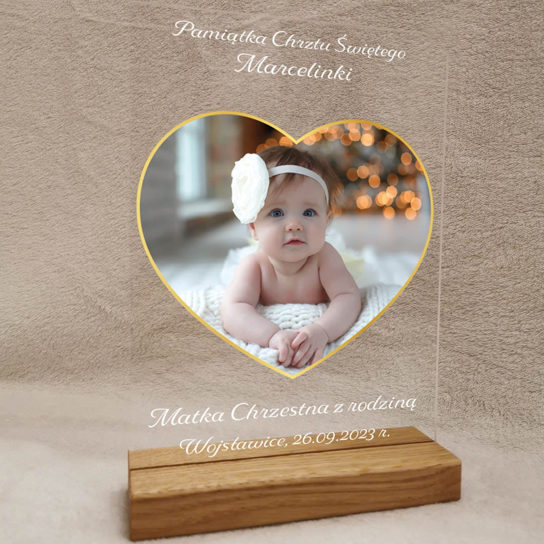 Pamiątka Chrztu Świętego Prezent na chrzest na szkle akrylowym ze zdjęciem złote serce
