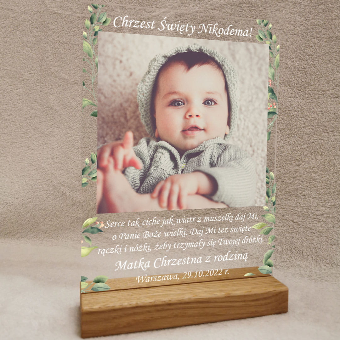 Pamiątka Chrztu Świętego w formie życzeń oraz zdjęcia dziecka na szkle z dopasowaną drewnianą podstawką to piękny i wyjątkowy prezent, który upamiętnia jeden z najważniejszych momentów w życiu dziecka. Nadruk na szkle w technologii UV doskonale odzwierciedla kolory grafik. Piękny i nowoczesny prezent z okazji chrztu świętego. Cena dotyczy jednej sztuki.