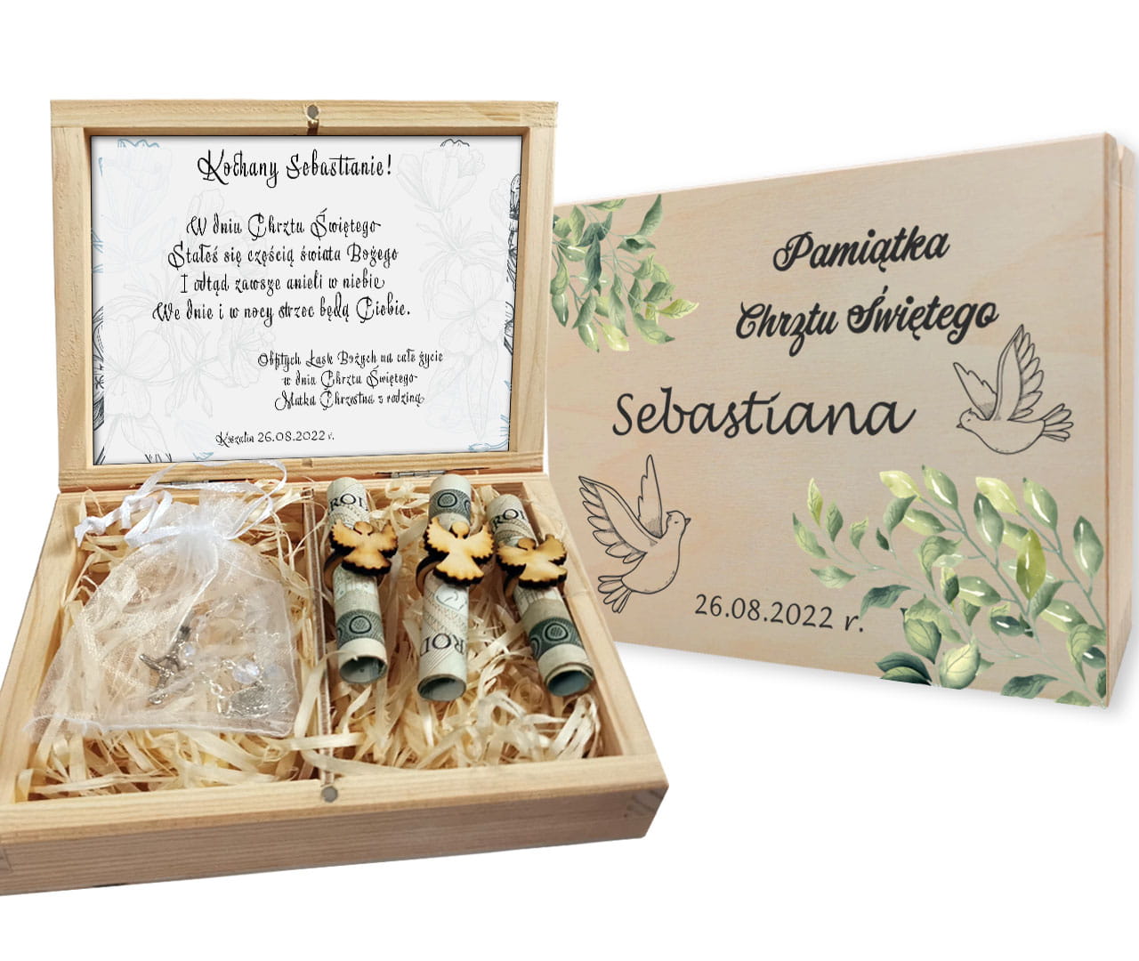 Pamiątka Chrztu Świętego w formie pudełeczka z przezroczystą dziesiątką różańca oraz trzema "aniołkami" na pieniądze. W górnej części pudełka znajduję się wklejka z życzeniami oraz personalizacją. Dolna część pudełka wypełniona jest wełną drzewną. Front jest nadrukowany technologią druku UV. Każda personalizacja jest przygotowana indywidualnie dla klienta. Pudełeczko może zostać świetnie wykorzystane jako pudełko na pieniądze z okazji Chrztu Świętego. Do każdego pudełeczka dodajemy trzy sztuki "aniołków z pierścionkiem" do umieszczenia pieniędzy. Banknoty nie są wyposażeniem pudełka. Istnieje możliwość umieszczenie własnego tekstu życzeń.
