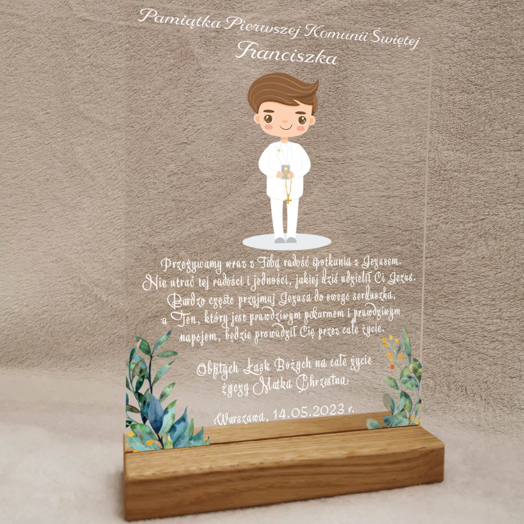 Elegancka pamiątka Pierwszej Komunii Świętej wykonana na szkle akrylowym z trwałym nadrukiem UV to wyjątkowy prezent na Komunię dla chłopca, który zachwyca swoim subtelnym wyglądem i symbolicznym przesłaniem.
