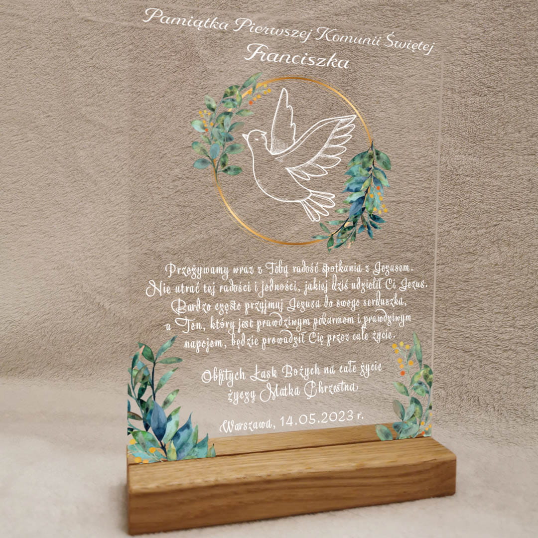 Pamiątka Pierwszej Komunii Świętej Prezent na Komunię - statuetka na szkle akrylowym gołąb w kole