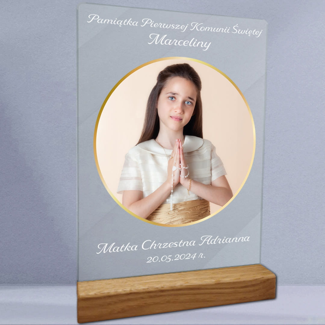 Wydruk na szkle akrylowym, technologia UV, pamiątka Pierwszej Komunii, prezent na komunię, personalizowany prezent, dekoracja domu, obraz na szkle, nowoczesna pamiątka, elegancki prezent, personalizacja.
