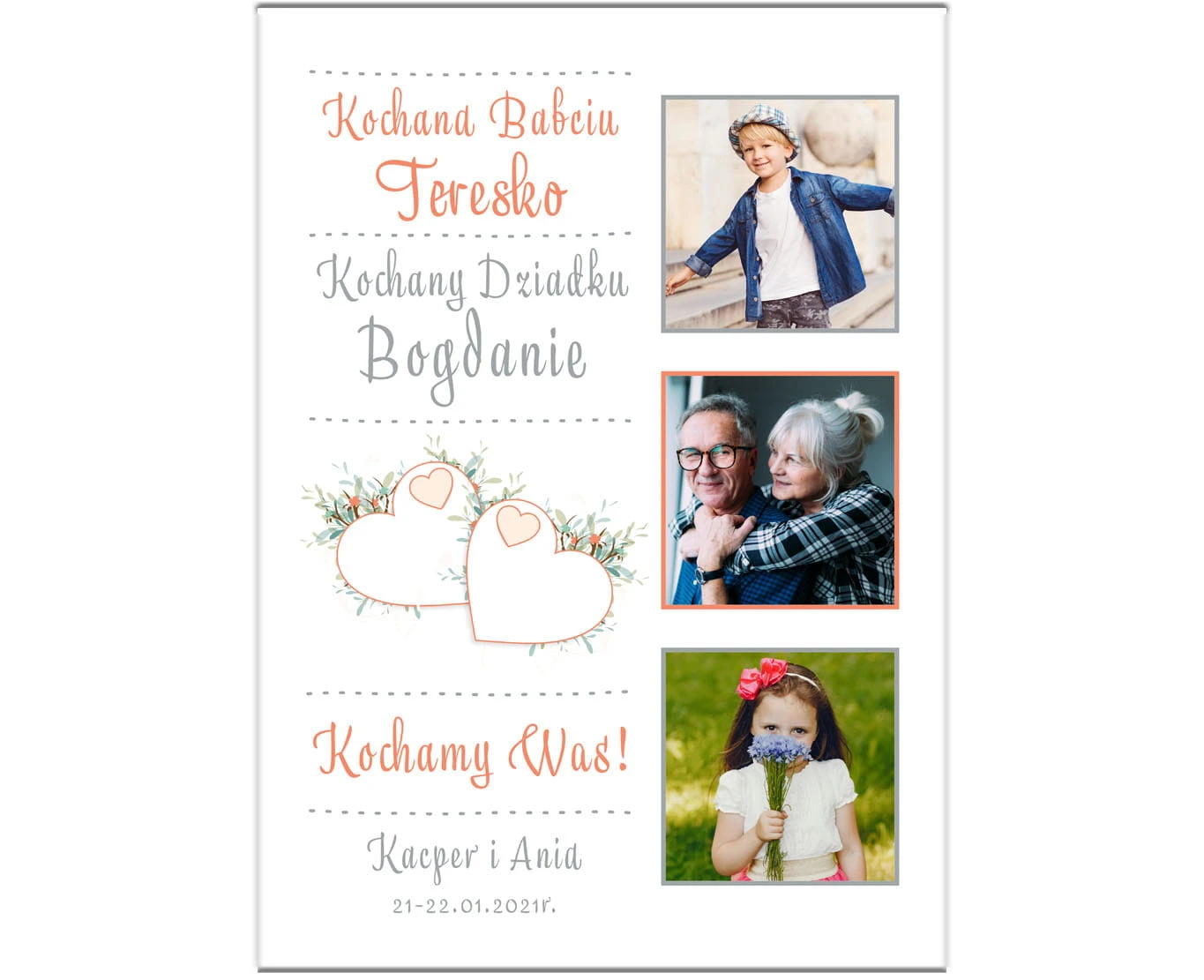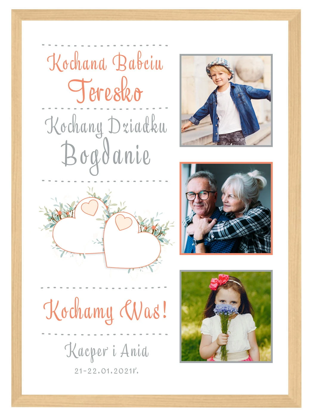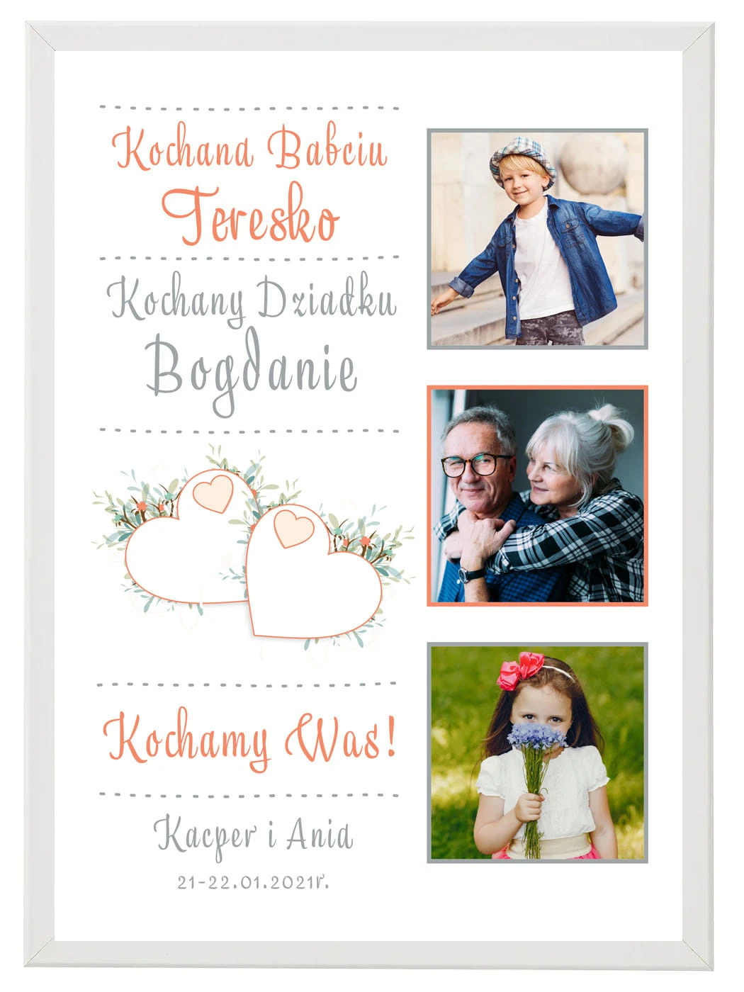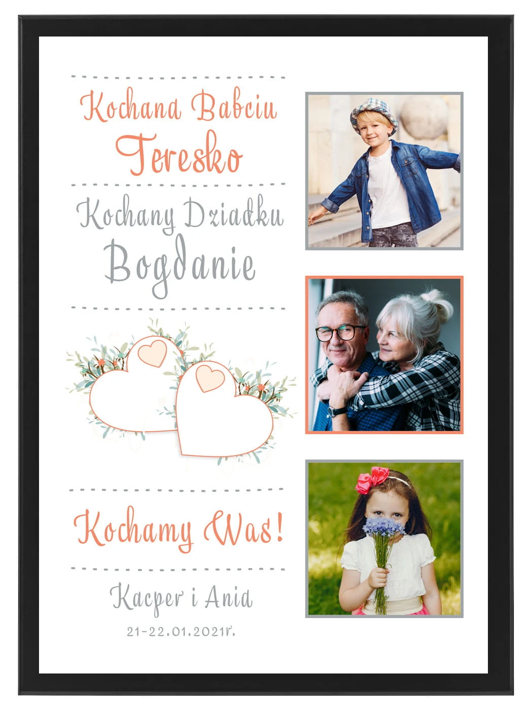 Piękny personalizowany prezent dla Babci i Dziadka z okazji ich wyjątkowego święta. Zaskocz swoich najbliższych cudownym upominkiem. Wszyscy mamy mnóstwo zdjęć w swoich telefonach, a coraz rzadziej przenosimy je na papier. My oferujemy Państwo pamiątkę ze zdjęciem z okazji dnia babci i dziadka w formie plakatu. Gwarantujemy, że łezka w oku Waszych najbliższych pojawi się ze wzruszenia.