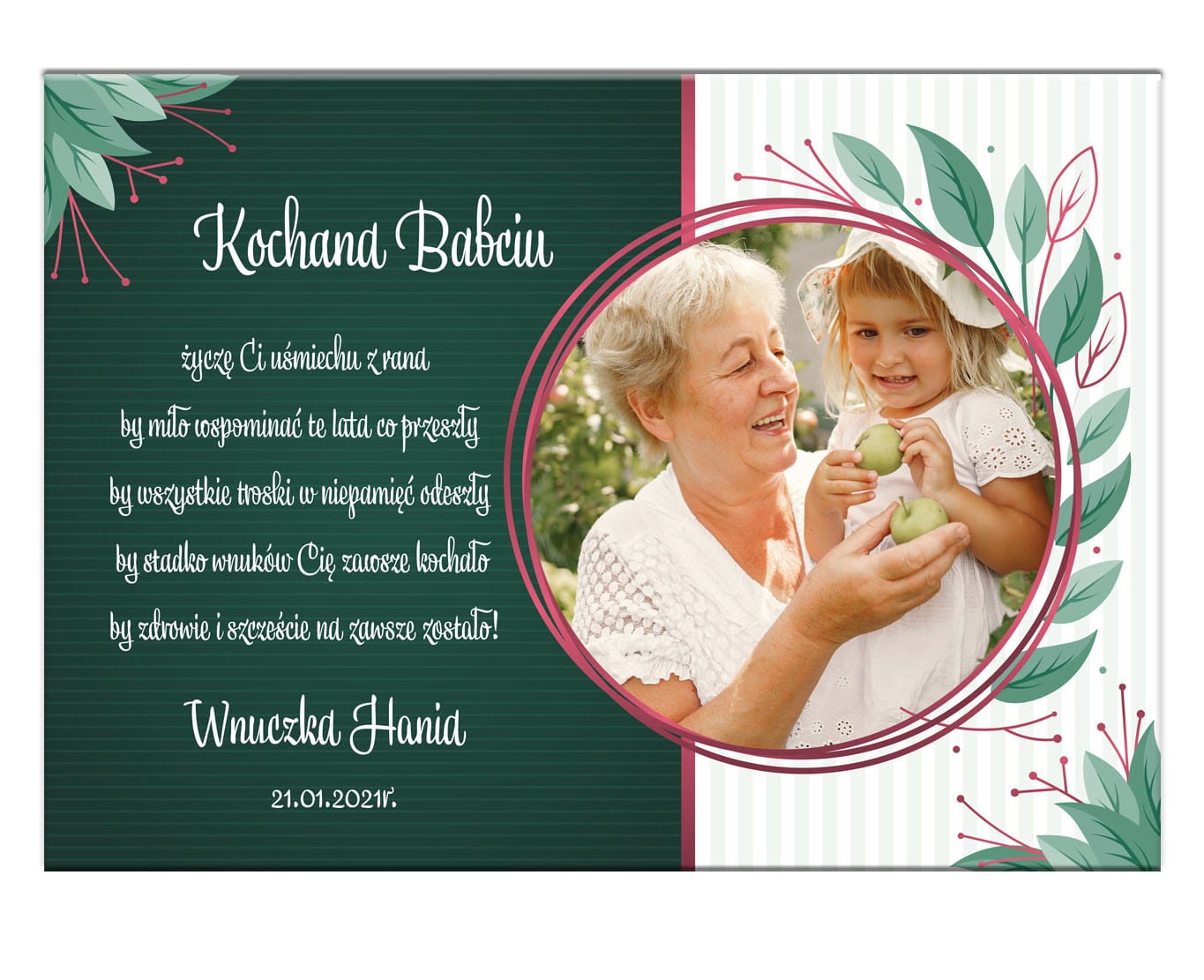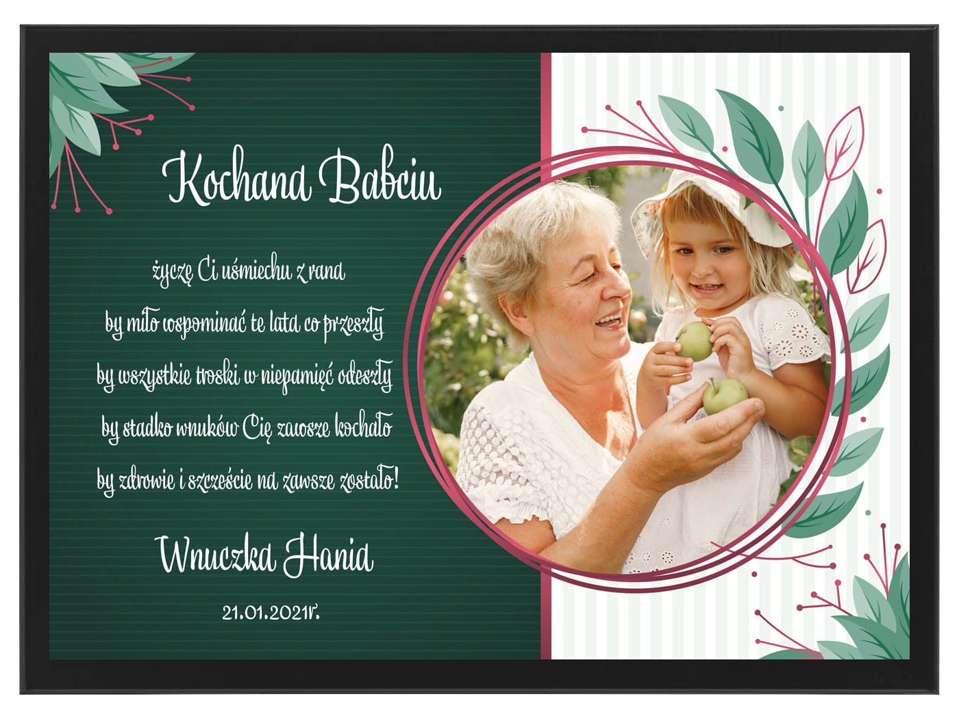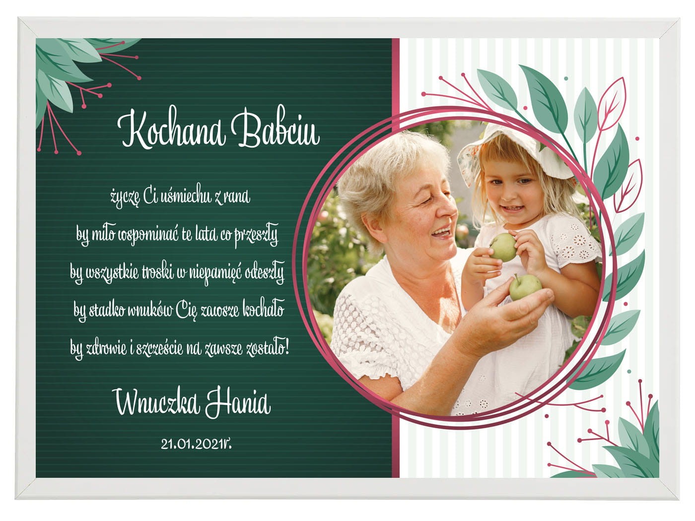 Piękny personalizowany prezent dla Babci i Dziadka z okazji ich wyjątkowego święta. Zaskocz swoich najbliższych cudownym upominkiem. Wszyscy mamy mnóstwo zdjęć w swoich telefonach, a coraz rzadziej przenosimy je na papier. My oferujemy Państwo pamiątkę ze zdjęciem z okazji dnia babci i dziadka w formie plakatu. Gwarantujemy, że łezka w oku Waszych najbliższych pojawi się ze wzruszenia.