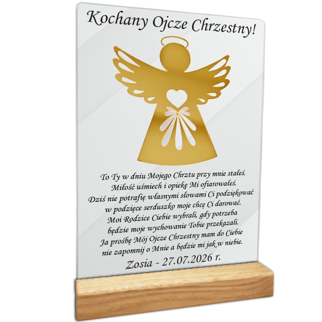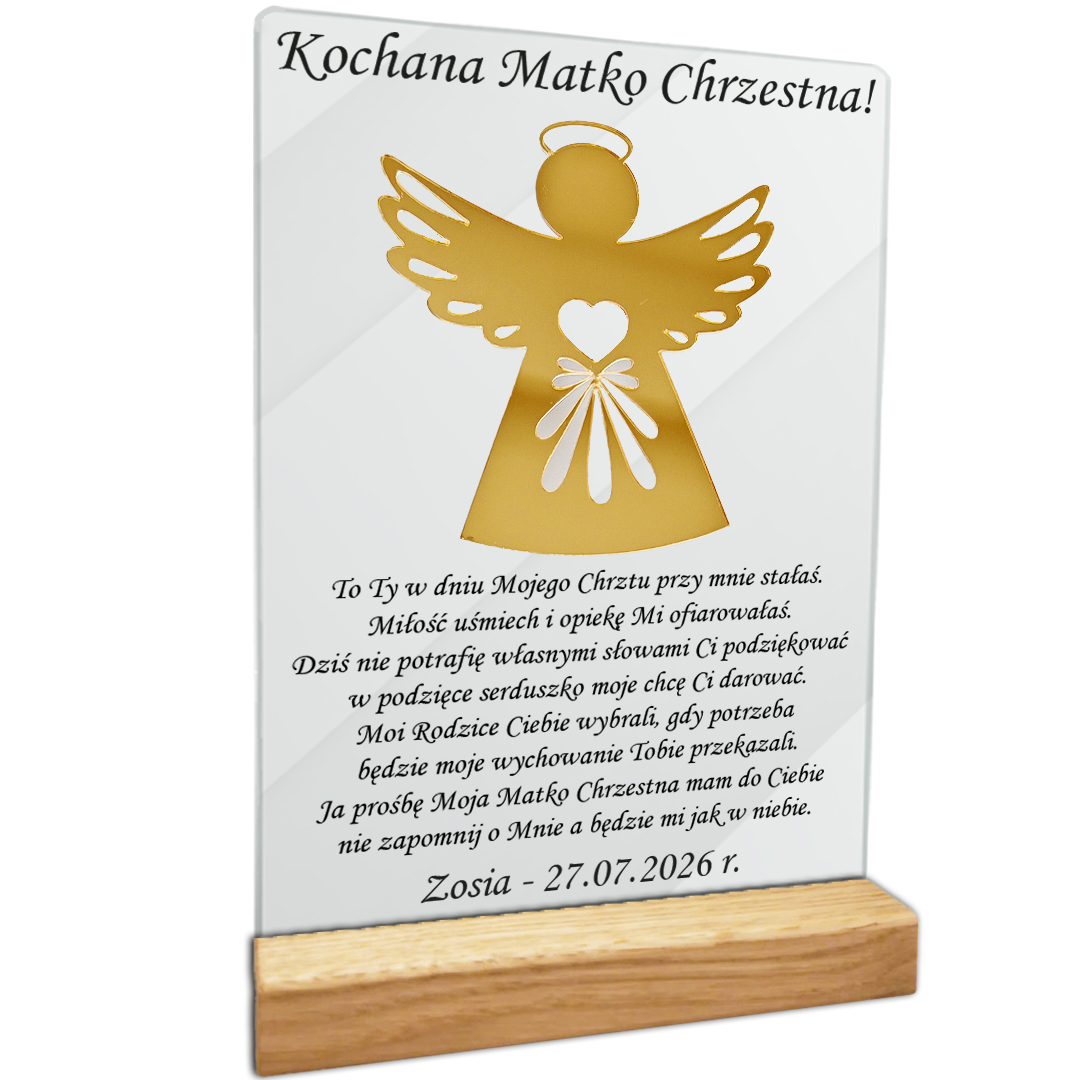 Głównym punktem tego podziękowania jest symbol Anioła Stróża, które został wycięty ze złotej plexi z niezwykłą precyzją przy użyciu technologii laserowej. Ten symbol stanie się nie tylko pamiątką, ale także symbolem miłości i wdzięczności dla rodziców chrzestnych za ich wsparcie i obecność w życiu Twojego dziecka.