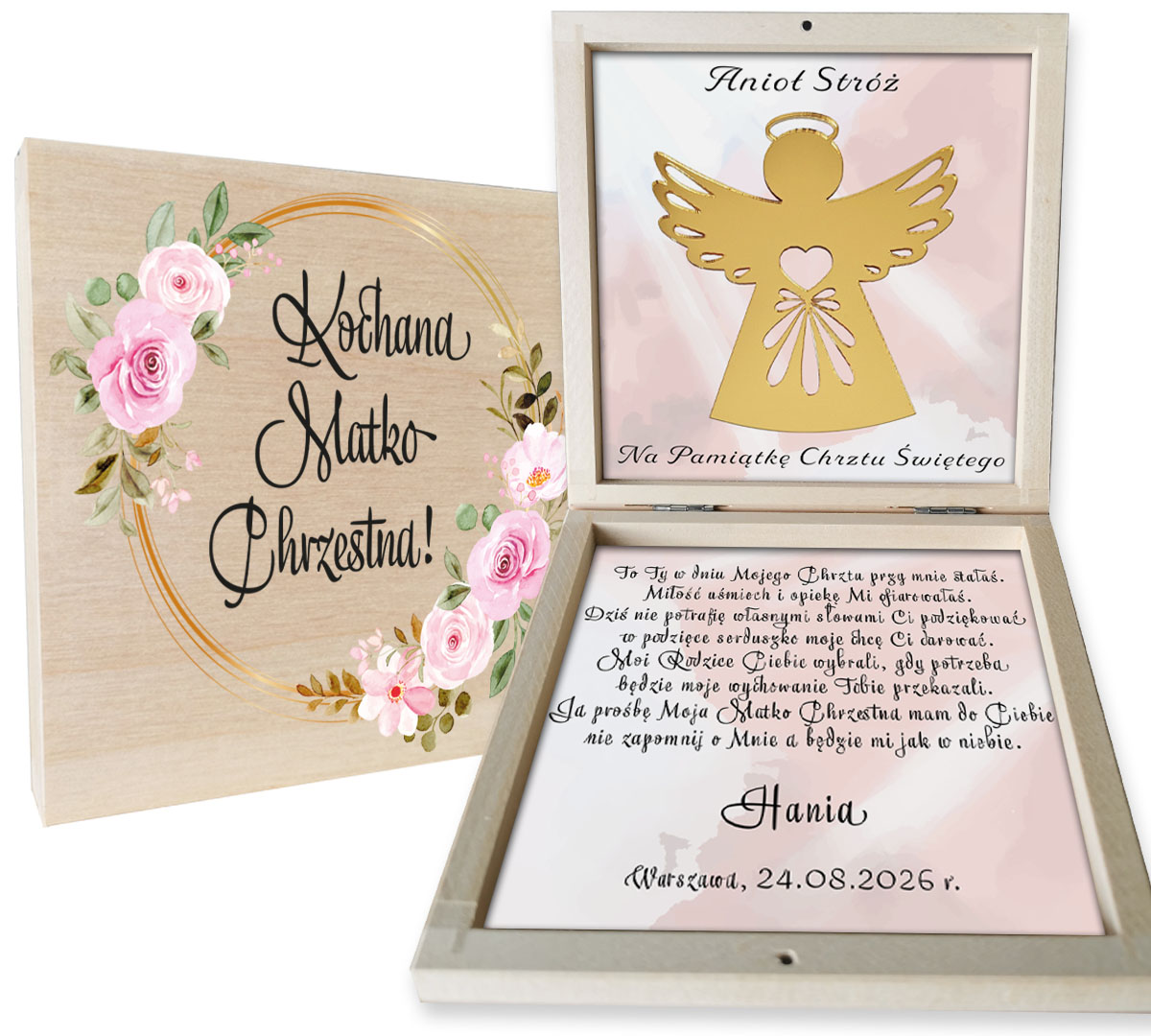 ✅ Tytuł na pudełku (do wyboru następujące nagłówki: Kochana Matko Chrzestna, Kochany Ojcze Chrzestny, Kochani Rodzice Chrzestni, Kochani Dziadkowie, Kochana Babciu, Kochany Dziadku)