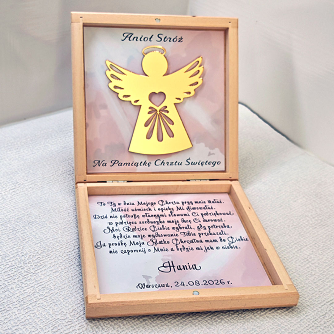 Podziękowanie dla rodziców chrzestnych oraz dziadków w formie pudełeczka. W pudełeczku znajduję się motyw złotego Aniołka wycięty ze złotej plexi co nadaje produktowi elegancji i szyku. . Front pudełeczka jest nadrukowany technologią druku UV. Każda personalizacja jest przygotowana indywidualnie dla klienta. Nie wysyłamy projektu do akceptacji. Pudełeczko może zostać dostosowane również jako podziękowanie dla dziadków.
