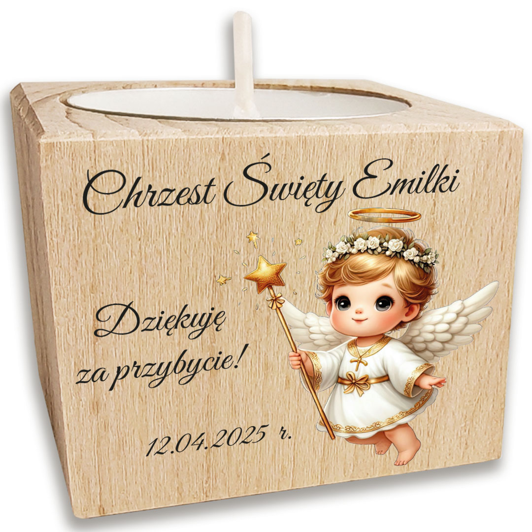 Podziękowania dla gościa na Chrzest Święty w formie świecznika z pięknym drukiem UV spersonalizowanym pod uroczystość!