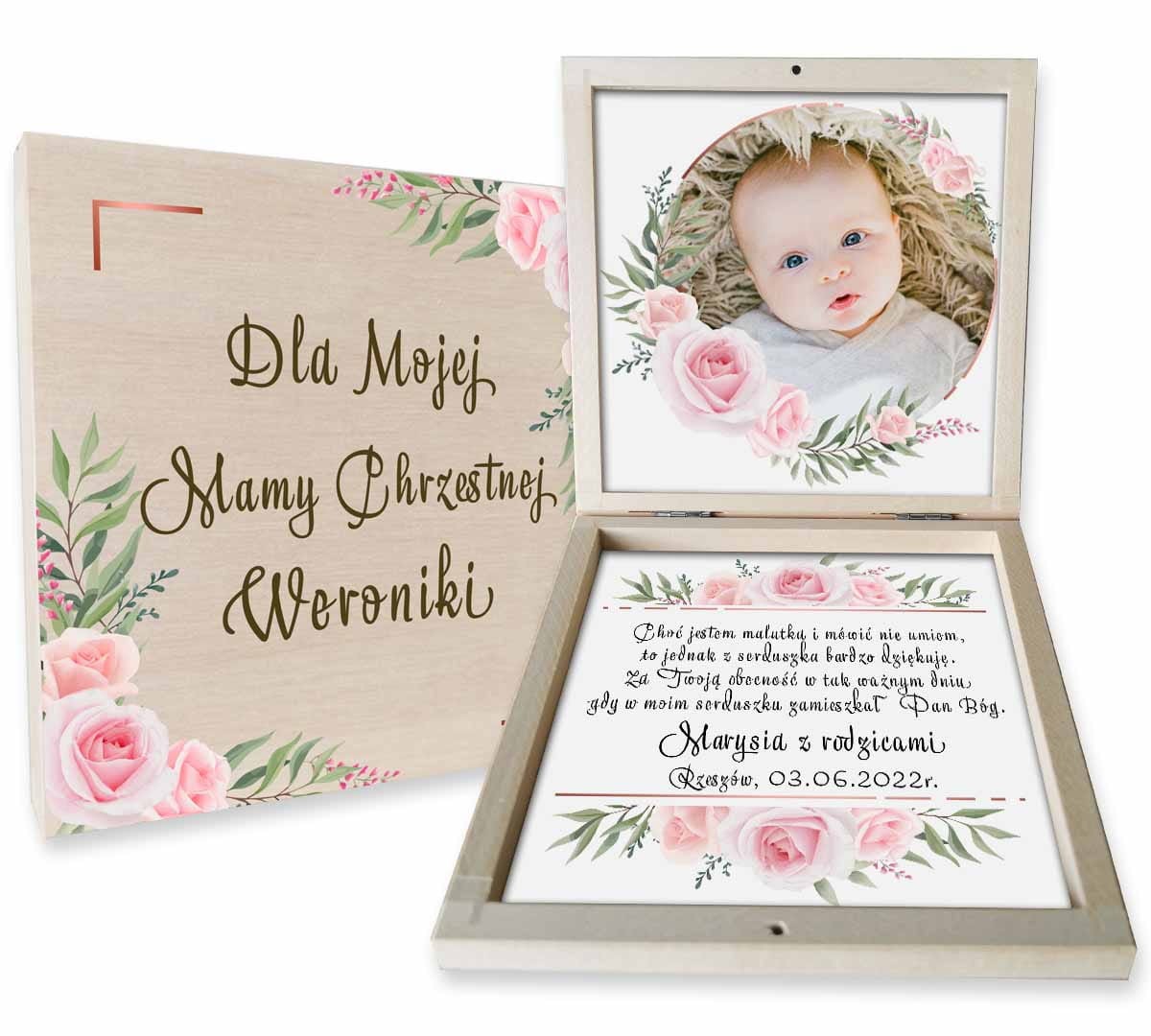 Podziękowania dla rodziców chrzestnych w formie pudełeczka. W pudełeczku znajduję się grafika ze zdjęciem dziecka oraz tekst podziękowań. Front pudełeczka jest nadrukowany technologią druku UV. Każda personalizacja jest przygotowana indywidualnie dla klienta. Pudełeczko może zostać również wykorzystane jako podziękowanie dla dziadków za obecność na Chrzcie Świętym