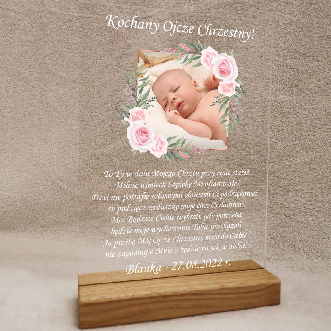 Niech to podziękowanie dla Rodziców Chrzestnych z udziałem zdjęcia Twojego dziecka na szkle akrylowym będzie wyrazem głębokiej wdzięczności i miłości, która towarzyszy w tych wyjątkowych momentach życia.