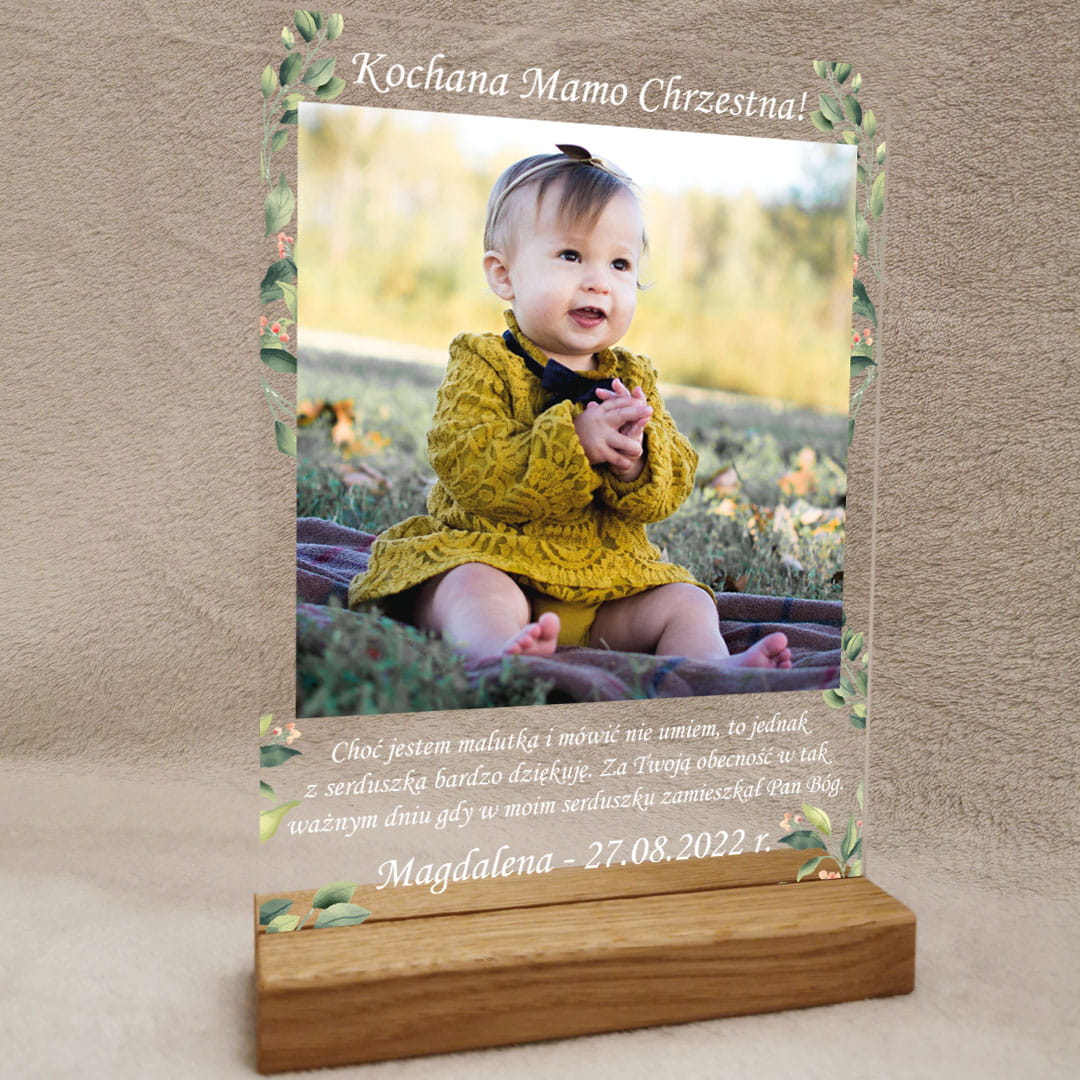 Niech to podziękowanie dla Rodziców Chrzestnych z udziałem zdjęcia Twojego dziecka na szkle akrylowym będzie wyrazem głębokiej wdzięczności i miłości, która towarzyszy w tych wyjątkowych momentach życia.