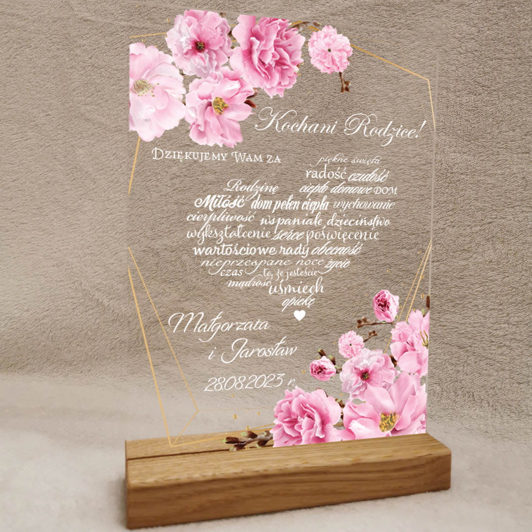 Podziękowanie ślubne dla rodziców w formie życzeń na szkle z dopasowaną dębową podstawką. Nadruk na szkle w technologii UV doskonale odzwierciedla kolory grafik. Piękny i nowoczesny prezent z okazji rocznicy ślubu.
