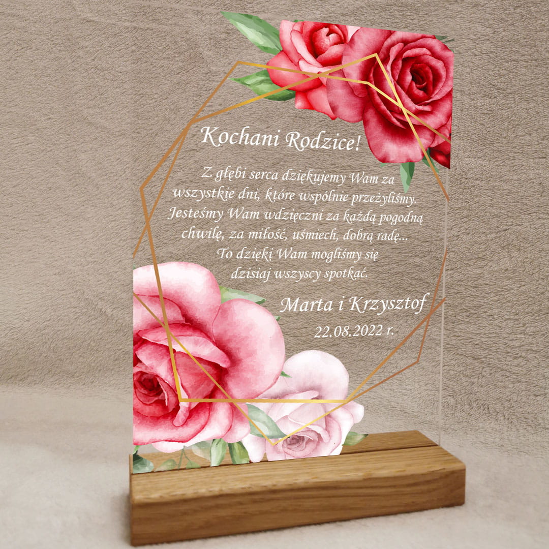 Podziękowanie ślubne dla rodziców prezent na ślub na szkle akrylowym róże