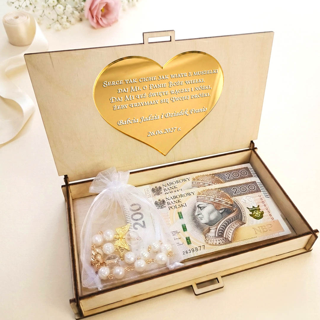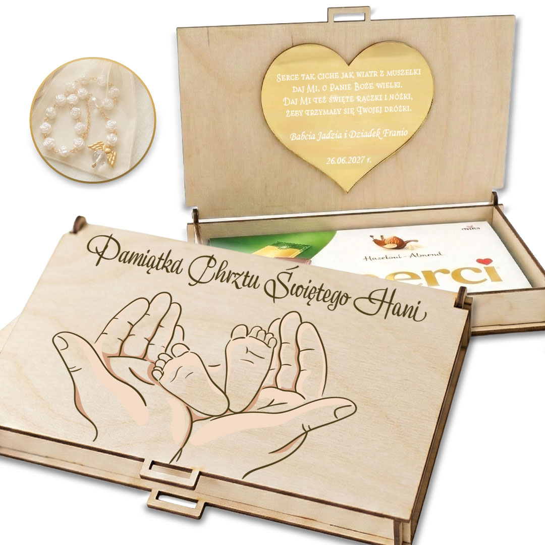 Chrzest Święty to wyjątkowy moment, który zasługuje na oprawę pełną klasy i elegancji. Jeśli szukasz alternatywy dla tradycyjnej koperty, nasze personalizowane drewniane pudełko będzie idealnym wyborem. To nie tylko stylowy sposób na wręczenie gotówki, ale przede wszystkim wzruszająca pamiątka, która zostanie z dzieckiem na długie lata.