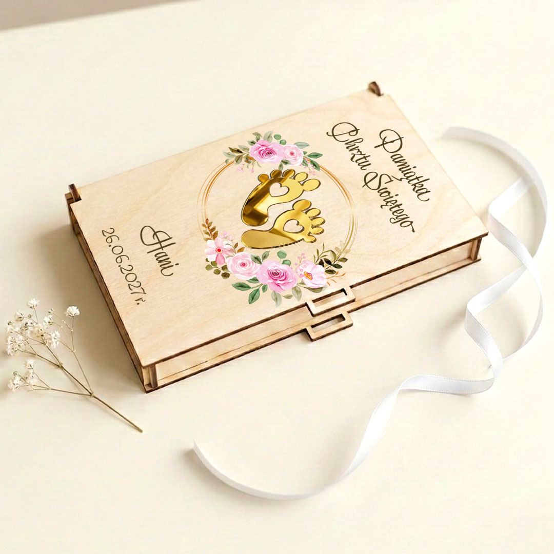 Pudełko zostało wykonane z wysokiej jakości sklejki brzozowe, co nadaje mu szlachetnego charakteru. Na wieczku znajduje się subtelny motyw dotyczący chrztu wykonany trwałą techniką nadruku UV oraz efektowne złote stópki z lustrzanego akrylu. Ten trójwymiarowy element przyciąga wzrok i nadaje prezentowi luksusowego wyglądu.