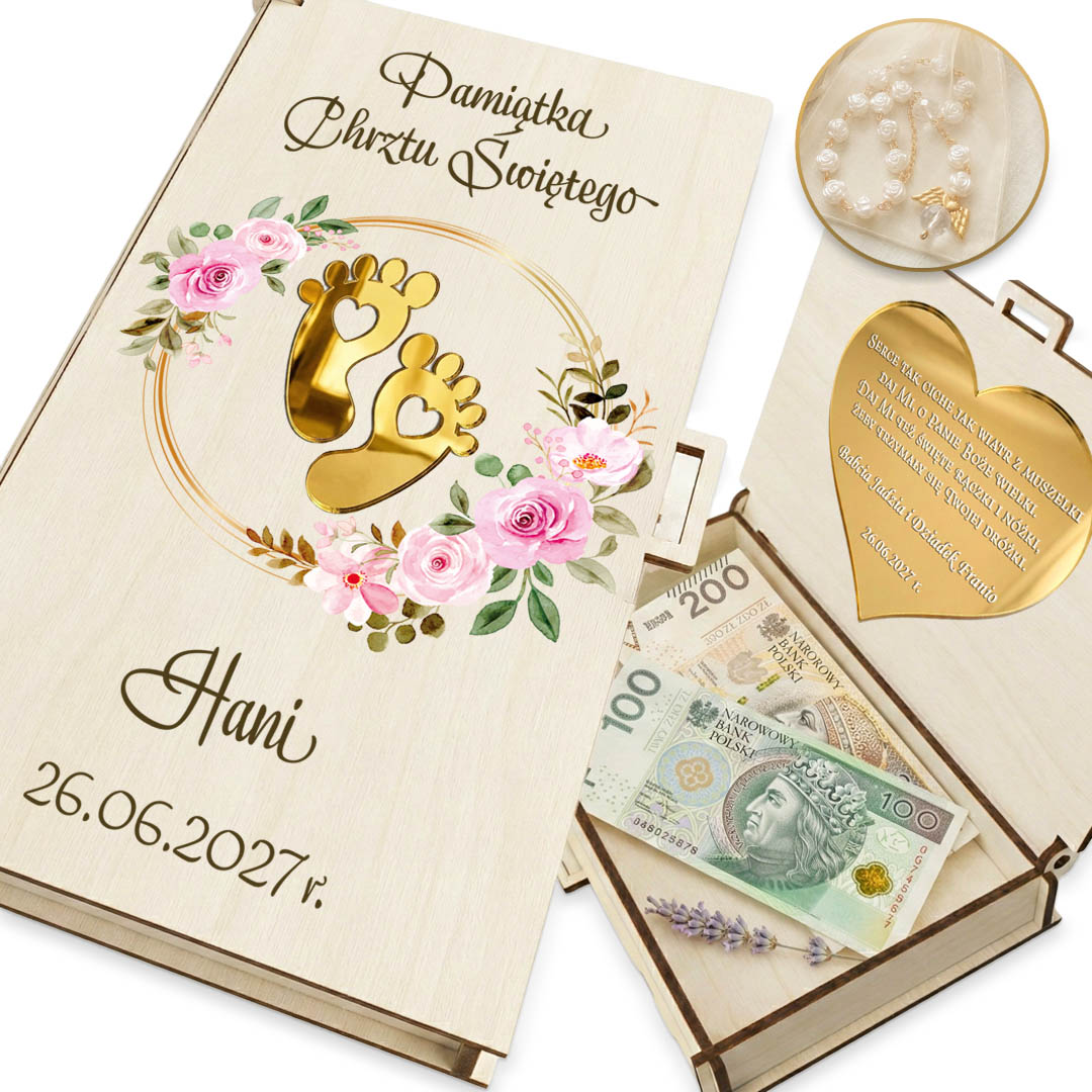 Chrzest Święty to wyjątkowy moment, który zasługuje na oprawę pełną klasy i elegancji. Jeśli szukasz alternatywy dla tradycyjnej koperty, nasze personalizowane drewniane pudełko będzie idealnym wyborem. To nie tylko stylowy sposób na wręczenie gotówki, ale przede wszystkim wzruszająca pamiątka, która zostanie z dzieckiem na długie lata.
