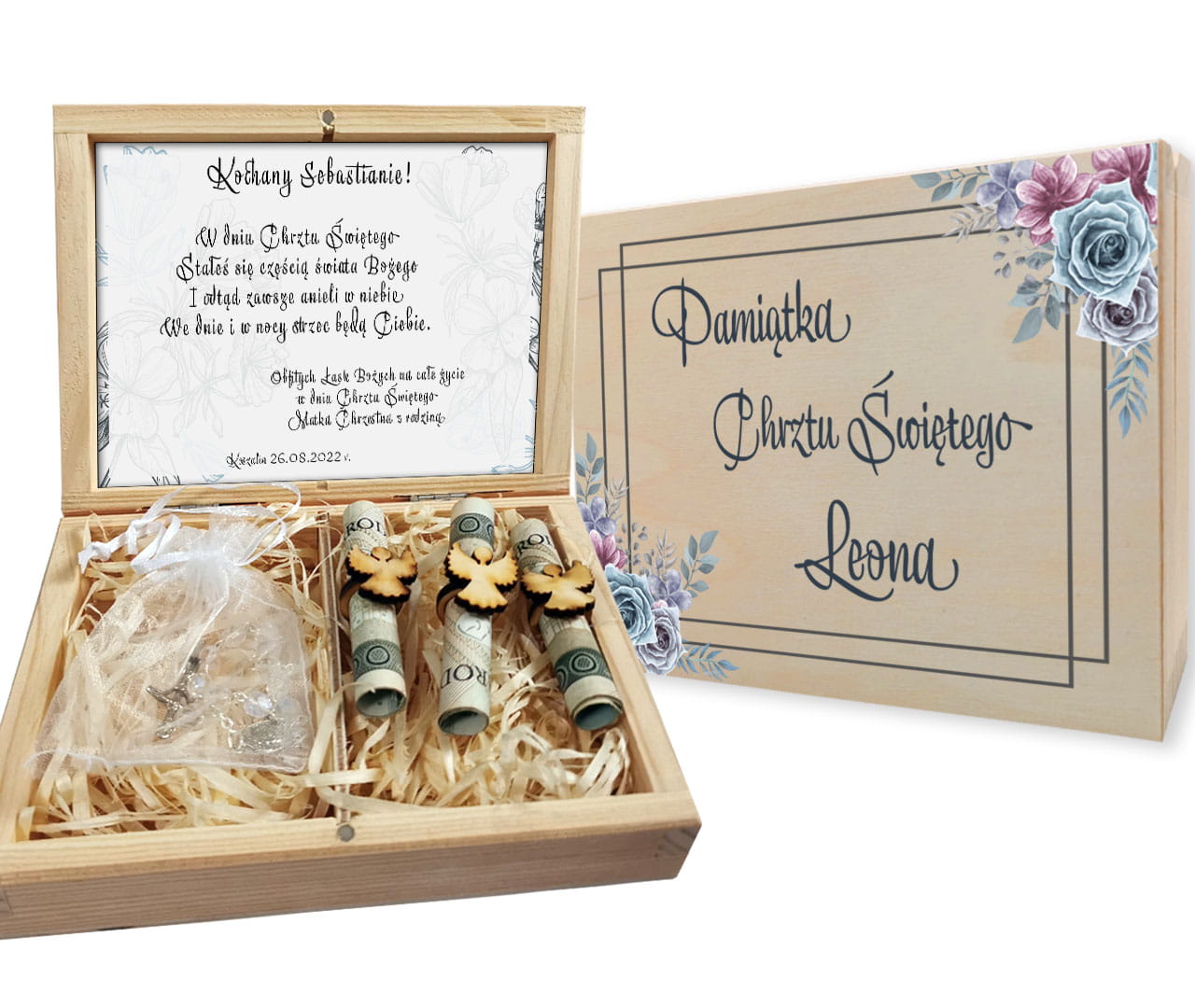 Pamiątka Chrztu Świętego w formie pudełeczka z przezroczystą dziesiątką różańca oraz trzema "aniołkami" na pieniądze. W górnej części pudełka znajduję się wklejka z życzeniami oraz personalizacją. Dolna część pudełka wypełniona jest wełną drzewną. Front jest nadrukowany technologią druku UV. Każda personalizacja jest przygotowana indywidualnie dla klienta. Pudełeczko może zostać świetnie wykorzystane jako pudełko na pieniądze z okazji Chrztu Świętego. Do każdego pudełeczka dodajemy trzy sztuki "aniołków z pierścionkiem" do umieszczenia pieniędzy. Banknoty nie są wyposażeniem pudełka. Istnieje możliwość umieszczenie własnego tekstu życzeń.