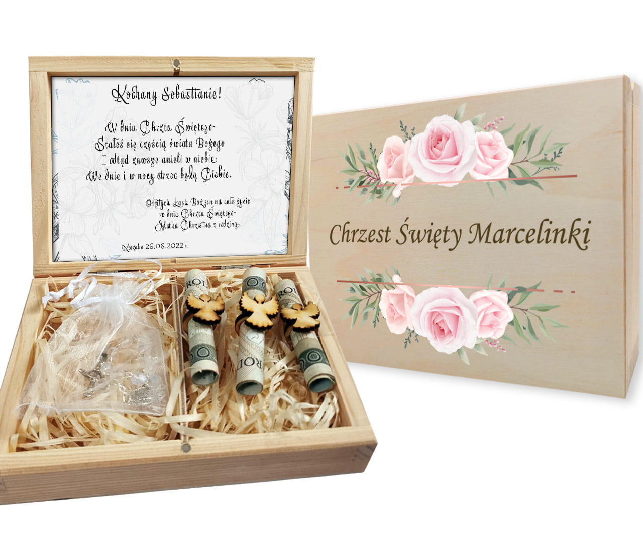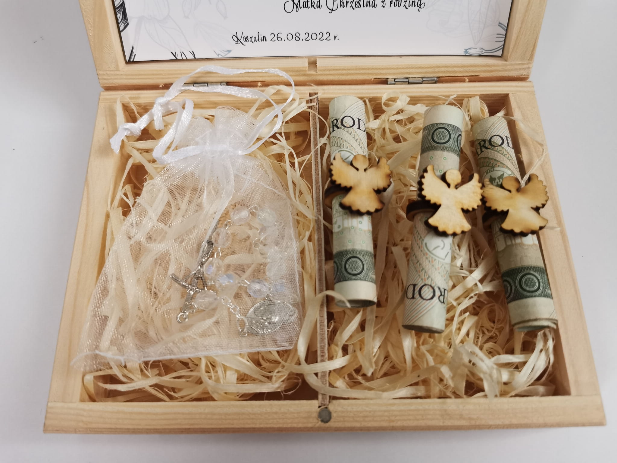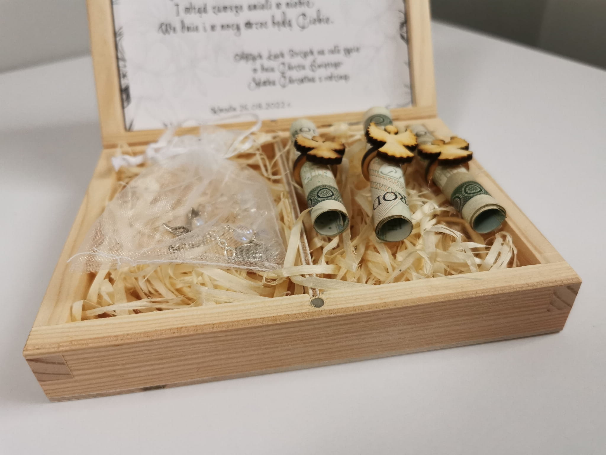 Pamiątka Chrztu Świętego w formie pudełeczka z przezroczystą dziesiątką różańca oraz trzema "aniołkami" na pieniądze. W górnej części pudełka znajduję się wklejka z życzeniami oraz personalizacją. Dolna część pudełka wypełniona jest wełną drzewną. Front jest nadrukowany technologią druku UV. Każda personalizacja jest przygotowana indywidualnie dla klienta. Pudełeczko może zostać świetnie wykorzystane jako pudełko na pieniądze z okazji Chrztu Świętego. Do każdego pudełeczka dodajemy trzy sztuki "aniołków z pierścionkiem" do umieszczenia pieniędzy. Banknoty nie są wyposażeniem pudełka. Istnieje możliwość umieszczenie własnego tekstu życzeń.