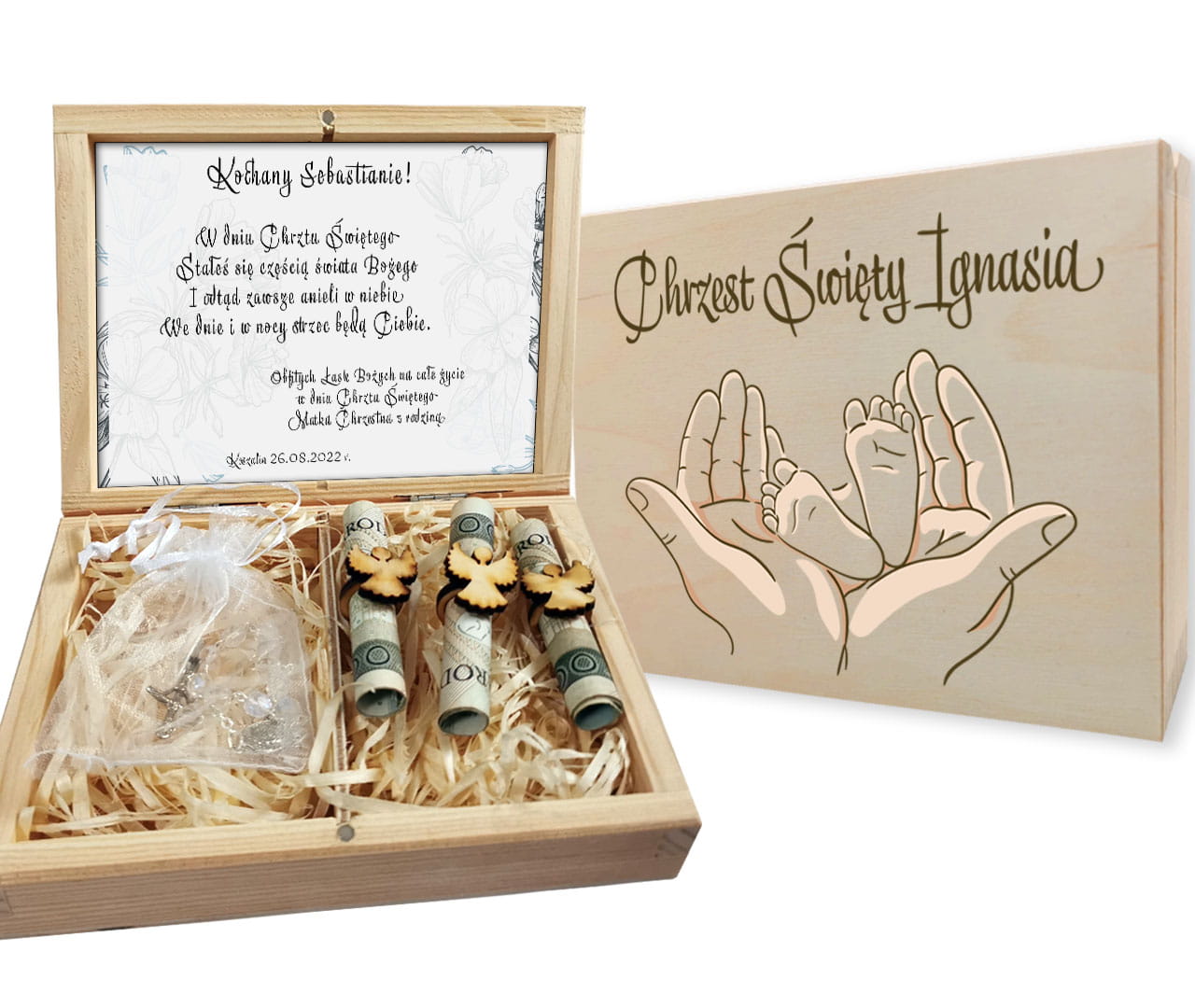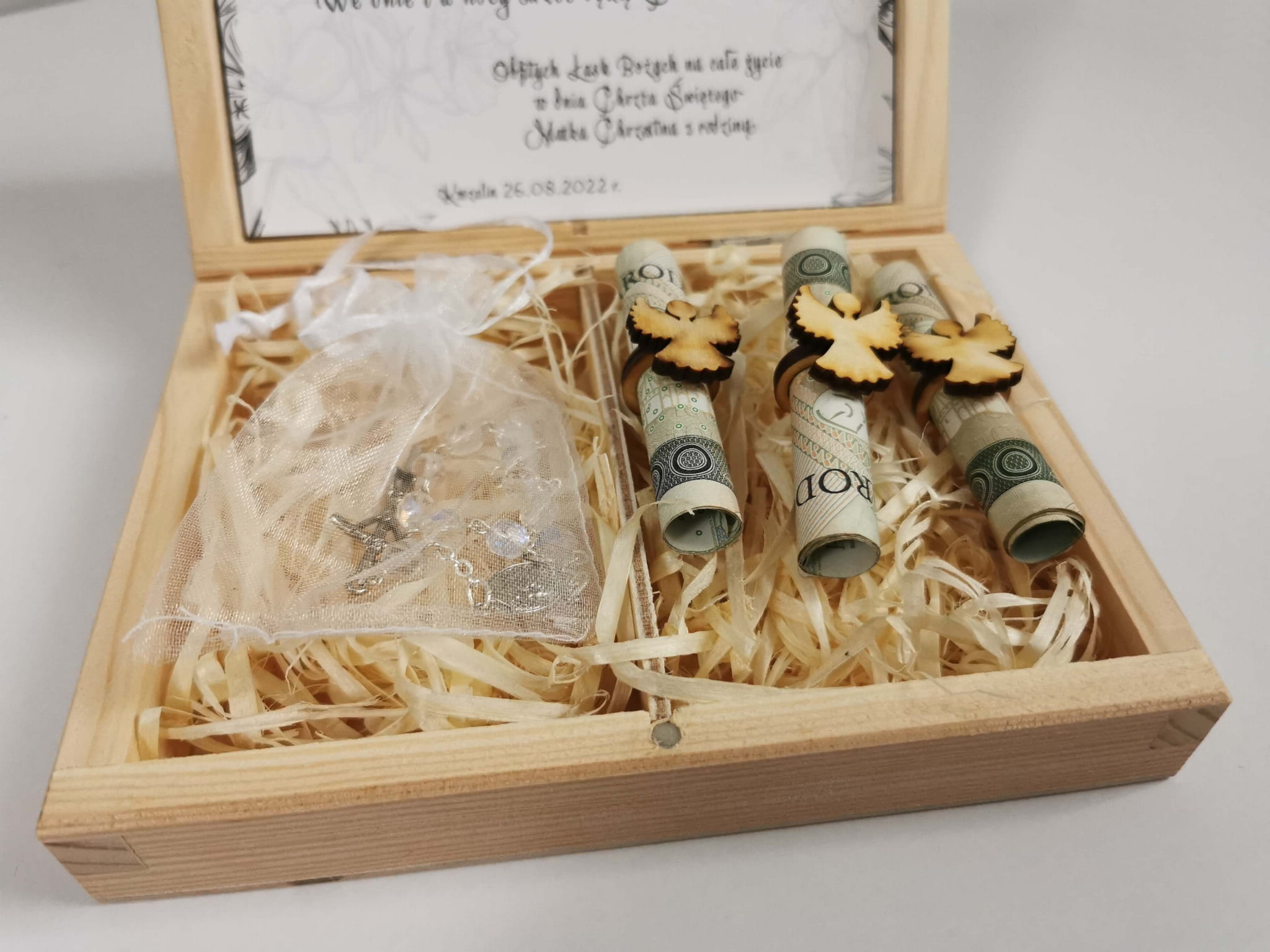 Pamiątka Chrztu Świętego w formie pudełeczka z przezroczystą dziesiątką różańca oraz trzema "aniołkami" na pieniądze. W górnej części pudełka znajduję się wklejka z życzeniami oraz personalizacją. Dolna część pudełka wypełniona jest wełną drzewną. Front jest nadrukowany technologią druku UV. Każda personalizacja jest przygotowana indywidualnie dla klienta. Pudełeczko może zostać świetnie wykorzystane jako pudełko na pieniądze z okazji Chrztu Świętego. Do każdego pudełeczka dodajemy trzy sztuki "aniołków z pierścionkiem" do umieszczenia pieniędzy. Banknoty nie są wyposażeniem pudełka. Istnieje możliwość umieszczenie własnego tekstu życzeń.