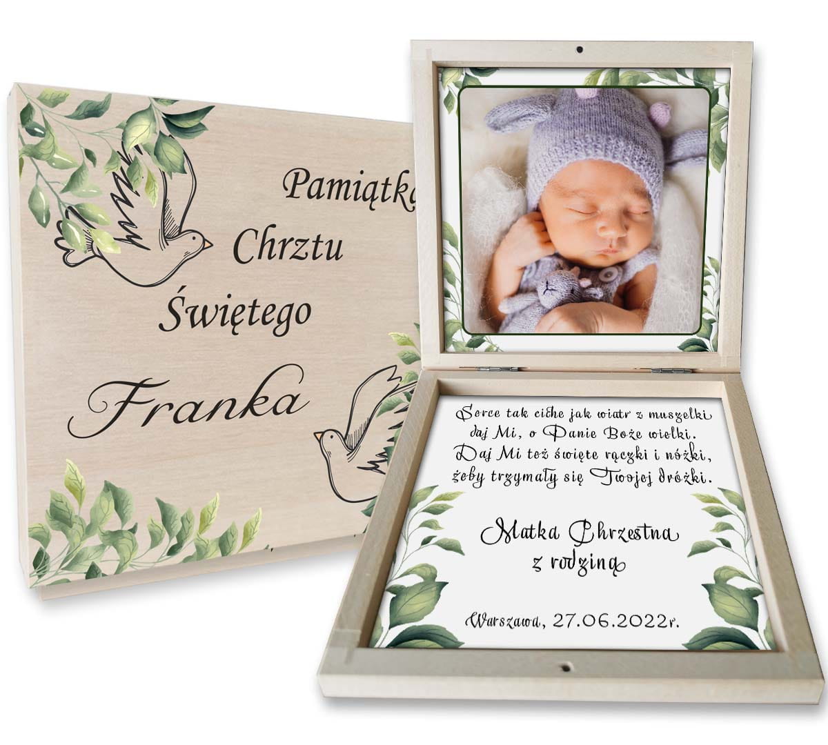 Pamiątka Chrztu Świętego w formie pudełeczka. W pudełeczku znajduję się grafika ze zdjęciem dziecka oraz życzenia. Front pudełeczka jest nadrukowany technologią druku UV. Każda personalizacja jest przygotowana indywidualnie dla klienta. Pudełeczko może zostać świetnie wykorzystane jako pudełko na pieniądze z okazji Chrztu Świętego. Do każdego pudełeczka dodajemy dwie sztuki "aniołków z pierścionkiem" do umieszczenia pieniędzy.