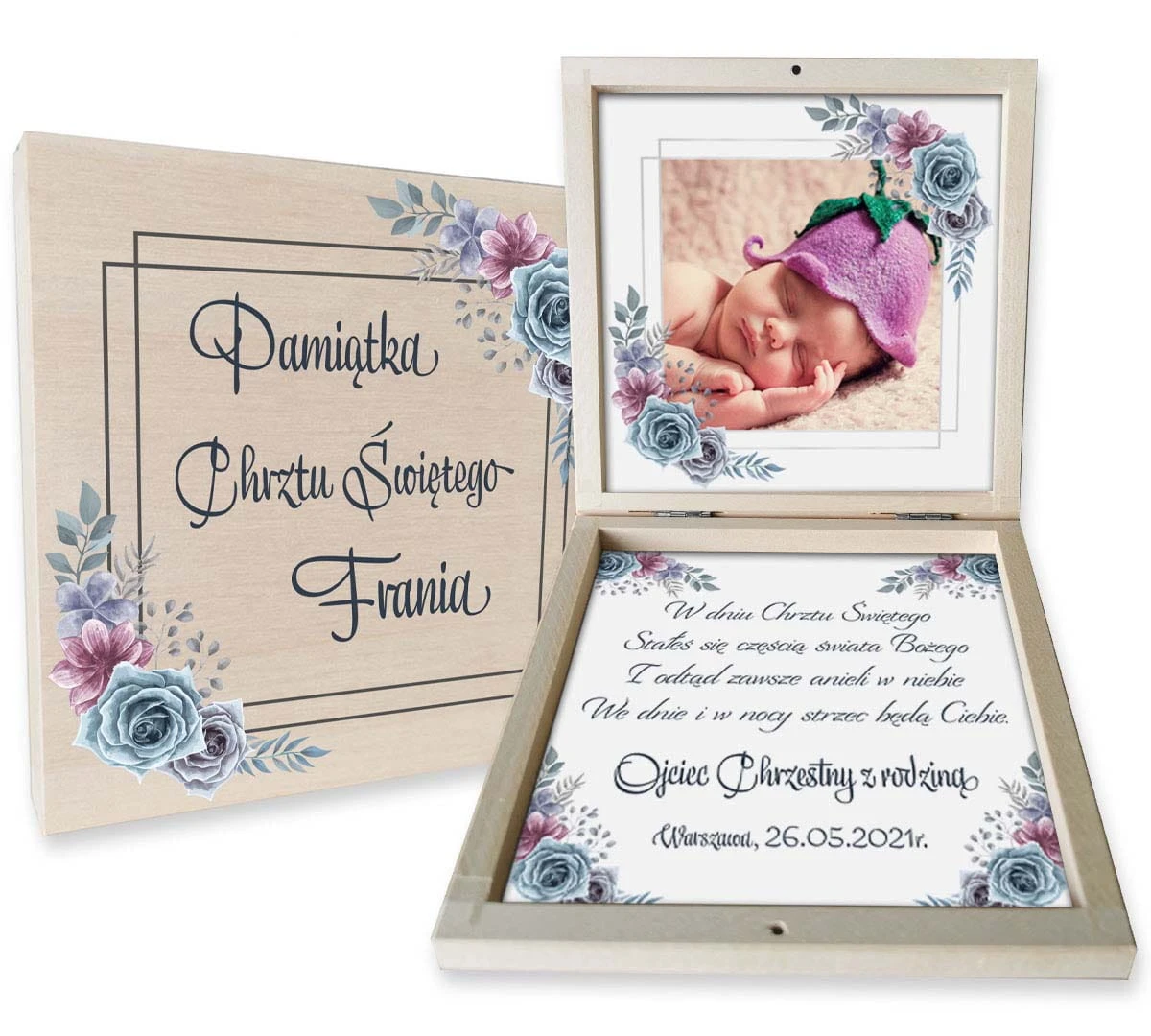 Pamiątka Chrztu Świętego w formie pudełeczka. W pudełeczku znajduję się grafika ze zdjęciem dziecka oraz życzenia. Front pudełeczka jest nadrukowany technologią druku UV. Każda personalizacja jest przygotowana indywidualnie dla klienta. Pudełeczko może zostać świetnie wykorzystane jako pudełko na pieniądze z okazji Chrztu Świętego. Do każdego pudełeczka dodajemy dwie sztuki "aniołków z pierścionkiem" do umieszczenia pieniędzy.