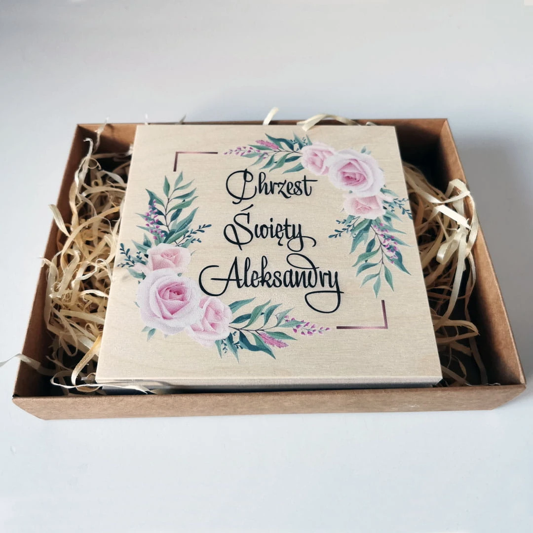 - skład: naturalne drewno w jasnym kolorze, wewnątrz którego znajduję się nadrukowana karteczka ze zdjęciem dziecka oraz życzeniami z rustykalną, spokojną grafiką
