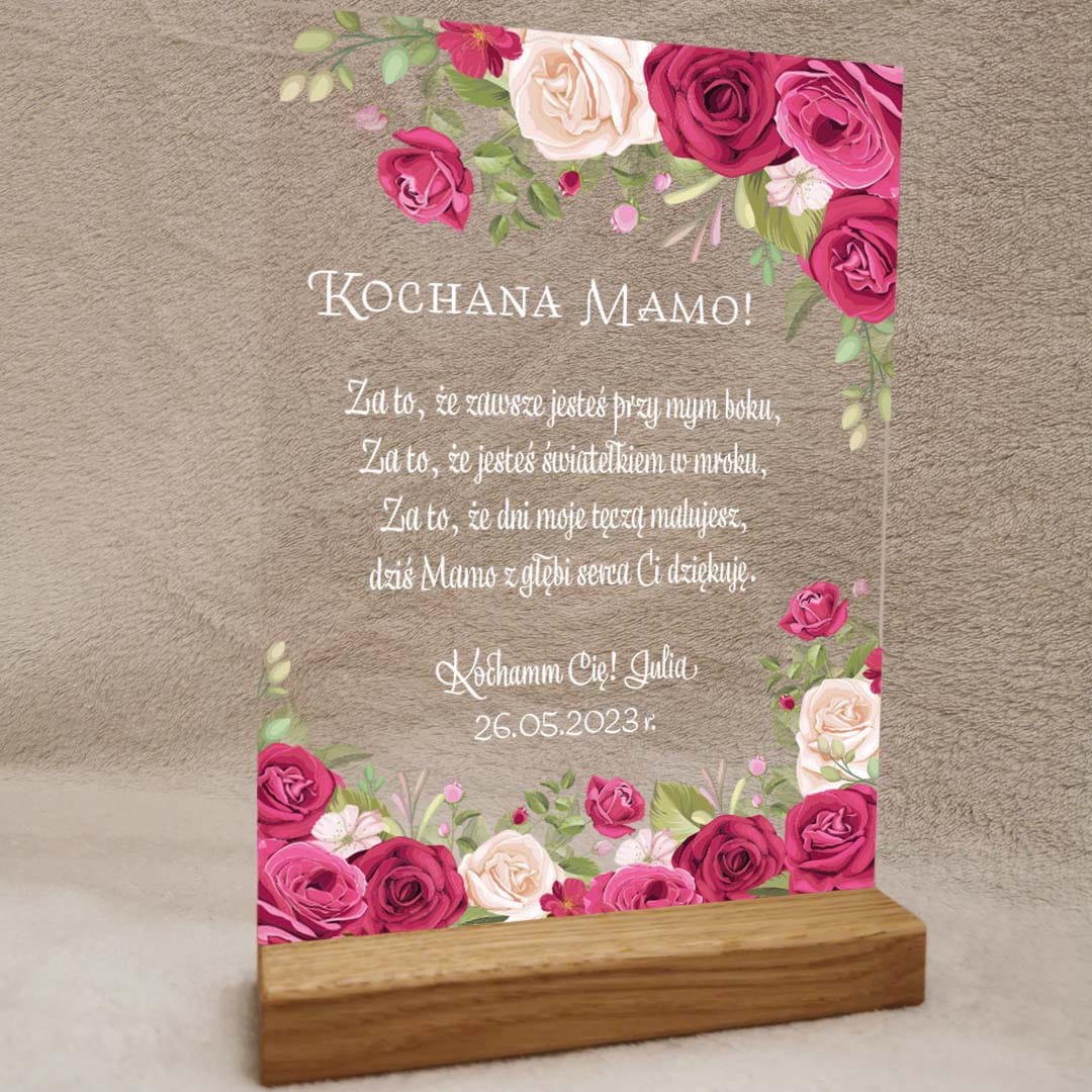Życzenia na szkle umieszczone w pięknej, drewnianej podstawce idealnie nada się do każdego wnętrza. Wydruk w technologii UV na szkle bezbarwnym (przezroczystym). Idealny i wyjątkowy prezent dla mamy na dzień matki.