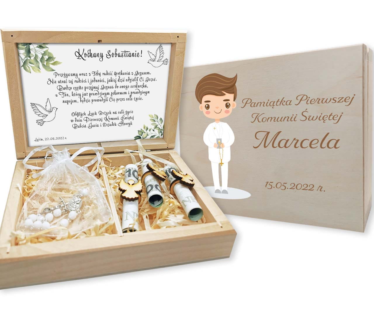 Pamiątka Pierwszej Komunii Świętej w formie pudełeczka z przezroczystą dziesiątką różańca oraz trzema "aniołkami" na pieniądze. W górnej części pudełka znajduję się wklejka z życzeniami oraz personalizacją. Dolna część pudełka wypełniona jest wełną drzewną. Front jest nadrukowany technologią druku UV. Każda personalizacja jest przygotowana indywidualnie dla klienta. Pudełeczko może zostać świetnie wykorzystane jako pudełko na pieniądze z okazji Pierwszej Komunii Świętej. Do każdego pudełeczka dodajemy trzy sztuki "aniołków z pierścionkiem" do umieszczenia pieniędzy. Banknoty nie są wyposażeniem pudełka. Istnieje możliwość umieszczenie własnego tekstu życzeń.
