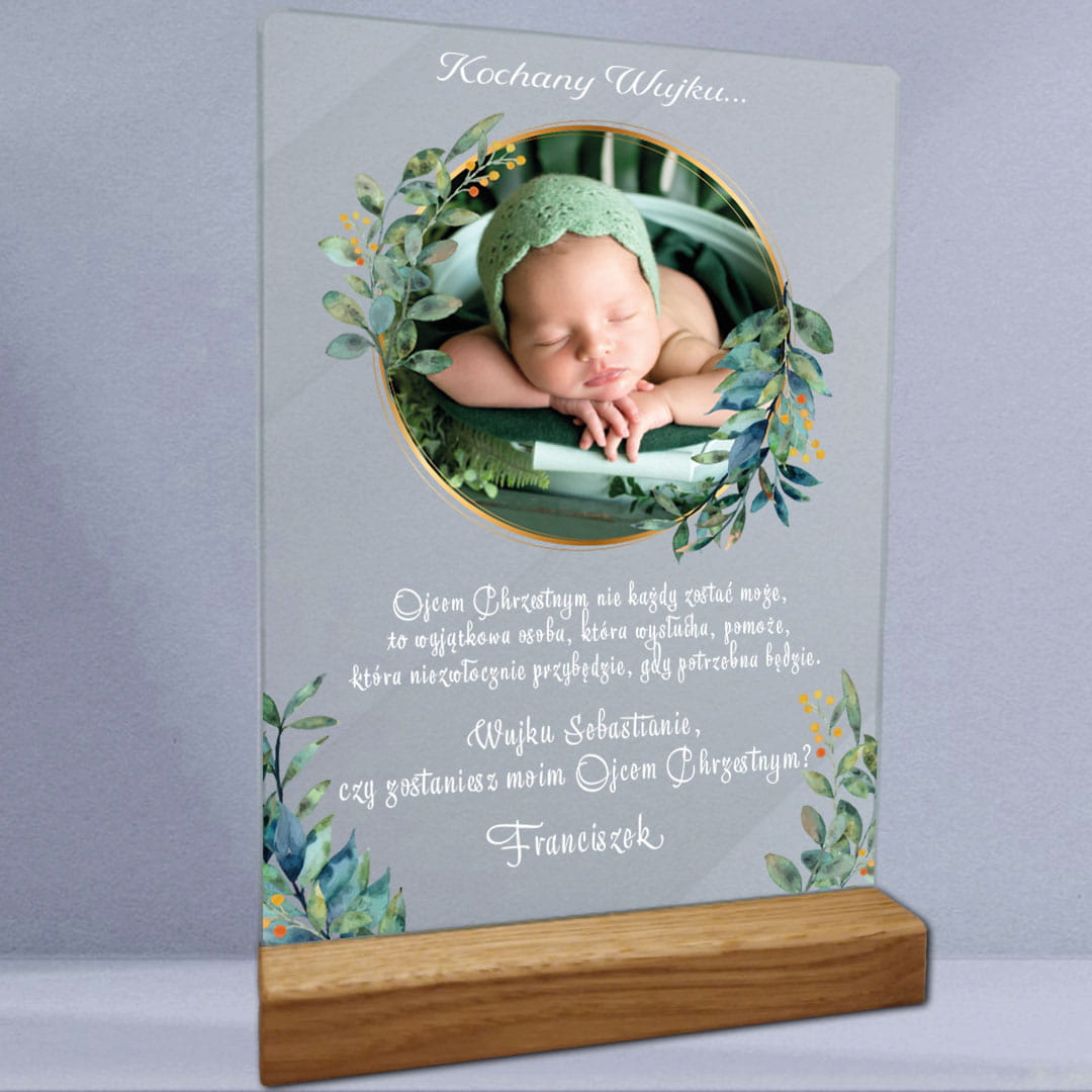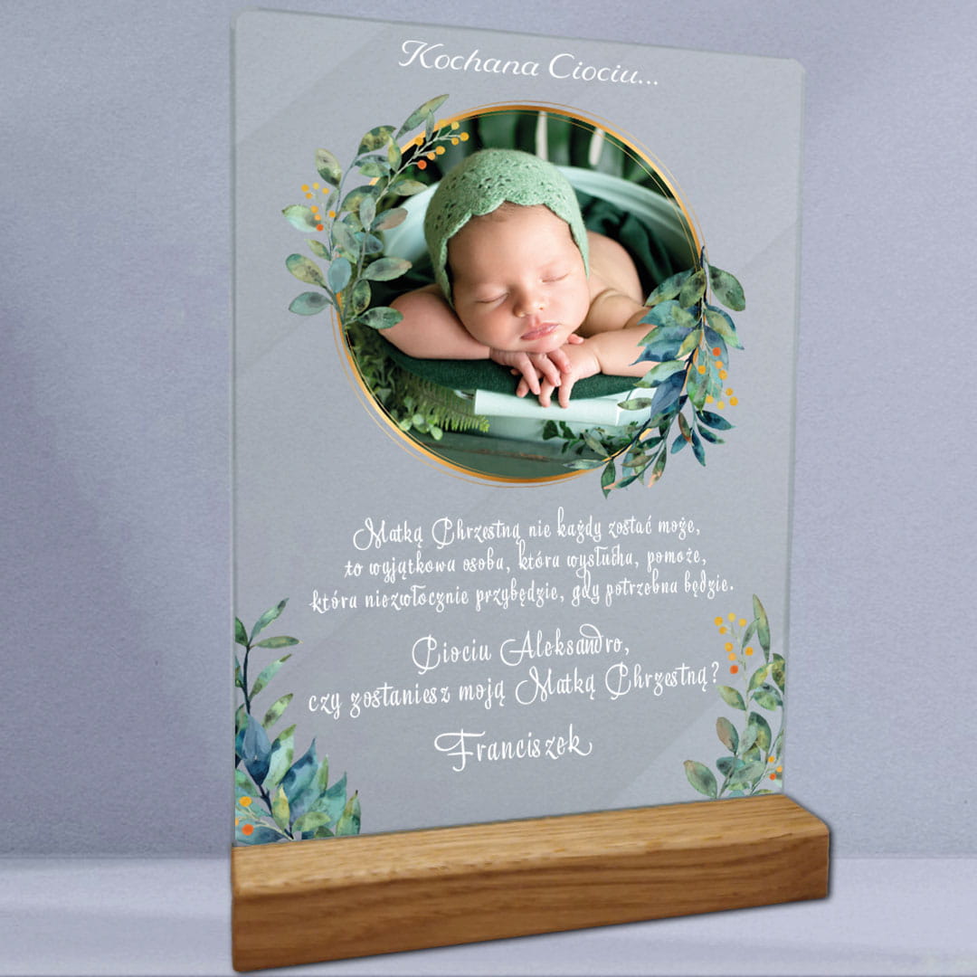 Idealne dla: prezent na chrzciny, zaproszenie dla rodziców chrzestnych, wydruk na szkle, personalizowany prezent, unikalna pamiątka.