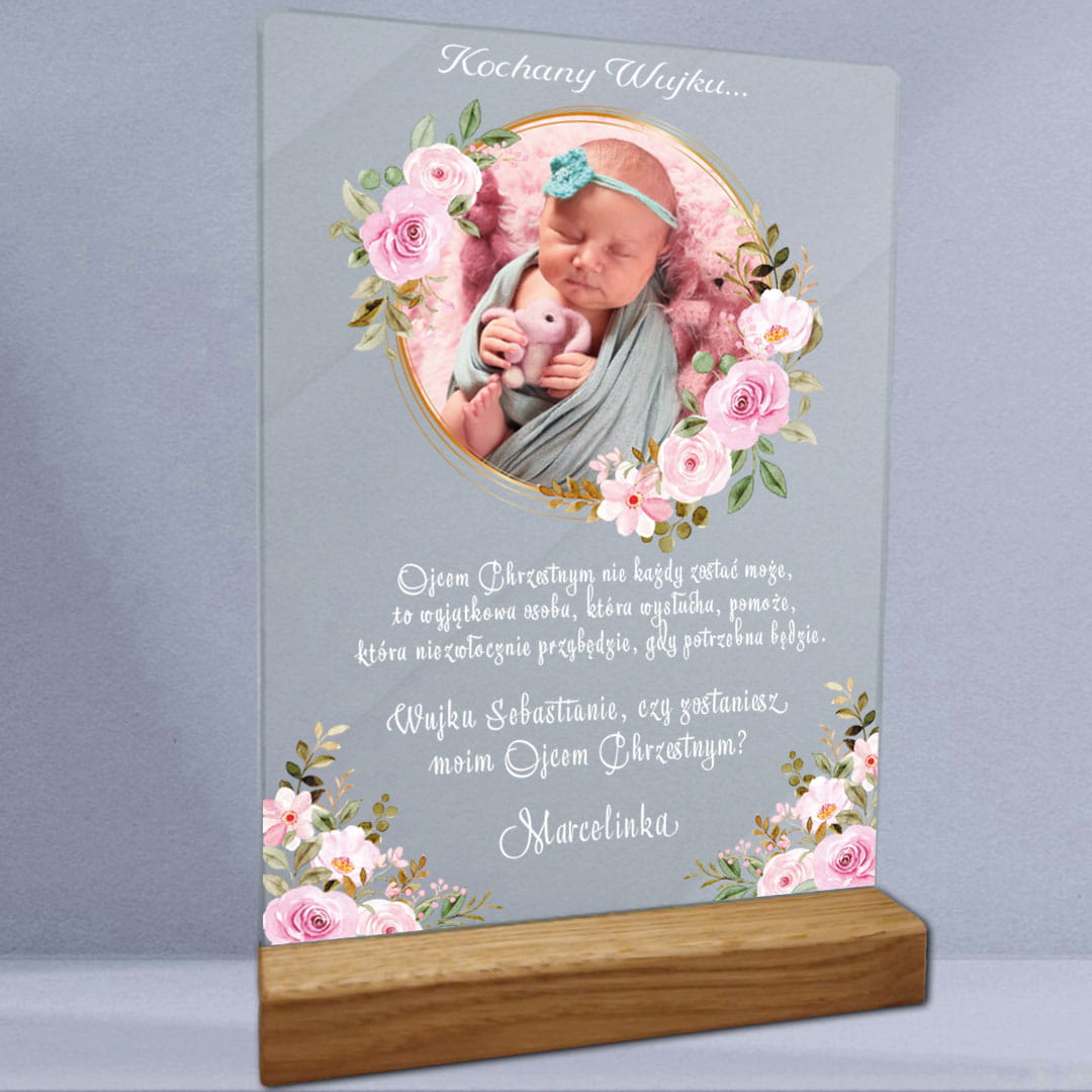 Idealne dla: prezent na chrzciny, zaproszenie dla rodziców chrzestnych, wydruk na szkle, personalizowany prezent, unikalna pamiątka.