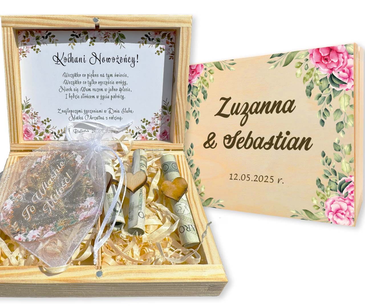 Idealny prezent na wesele dla pary młodej. Zapomnij o nudnych standardowych kopertach, nasze pudełko wykonane z drewna naturalnego oraz sklejki i z nadrukiem UV sprawi wielkie wrażenie nie tylko na parze młodej.