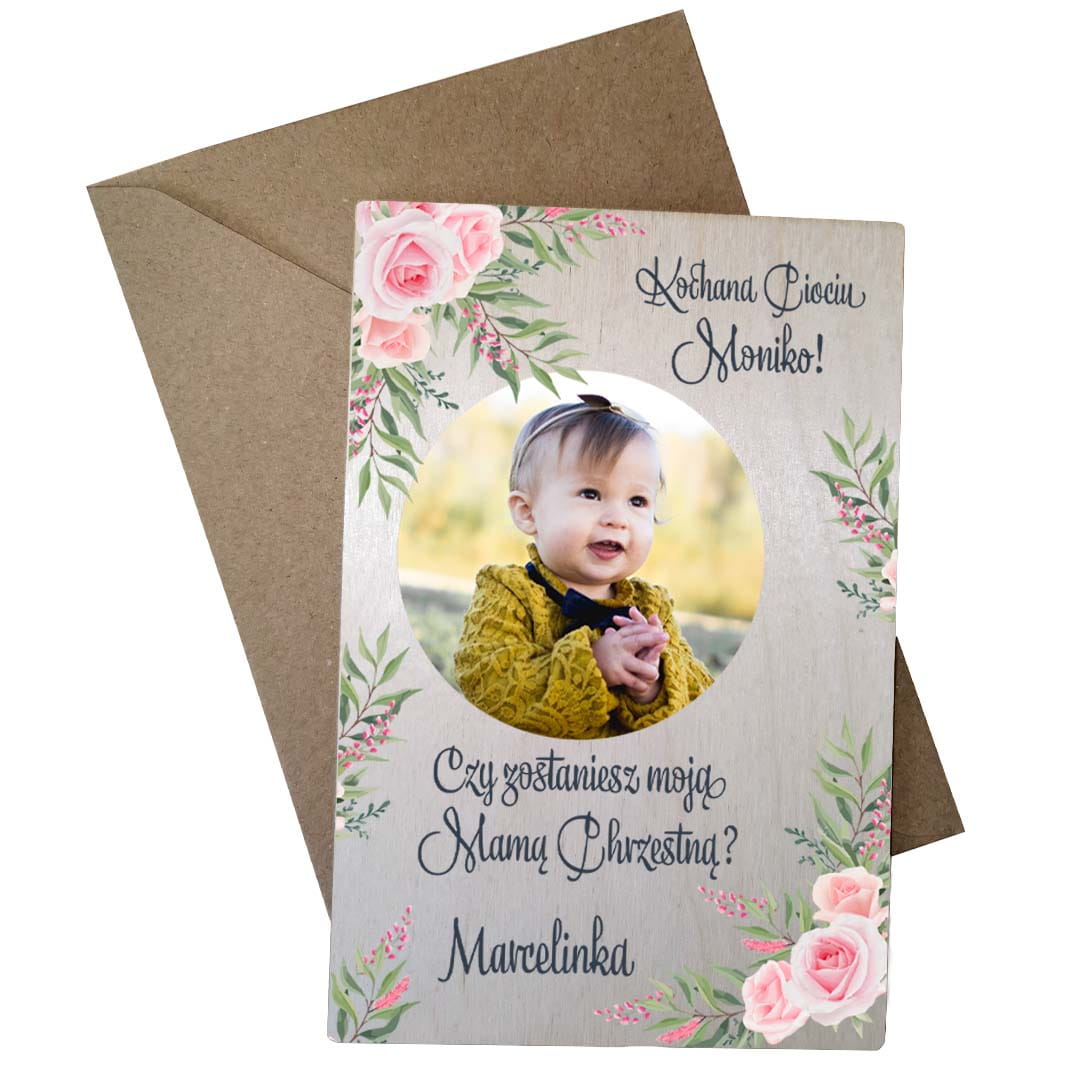 Drewniana kartka ze zdjęciem - pytanie do Mamy Chrzestnej oraz pytanie do Taty Chrzestnego.