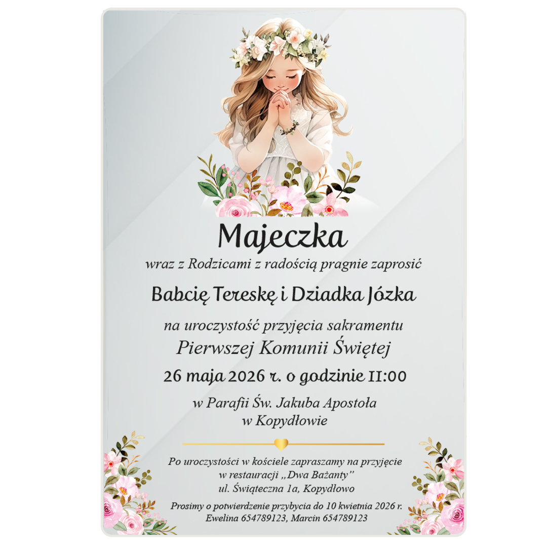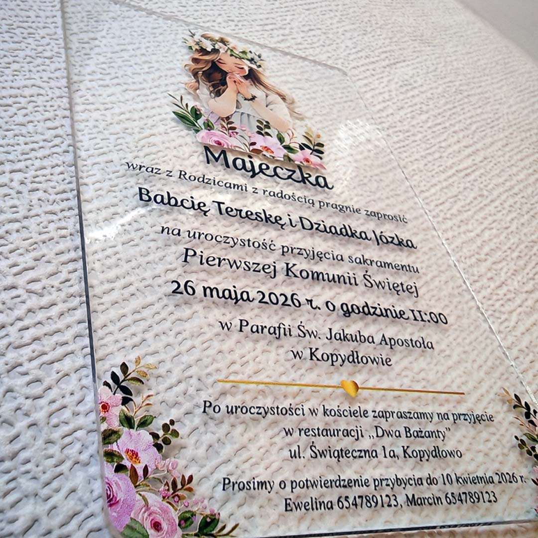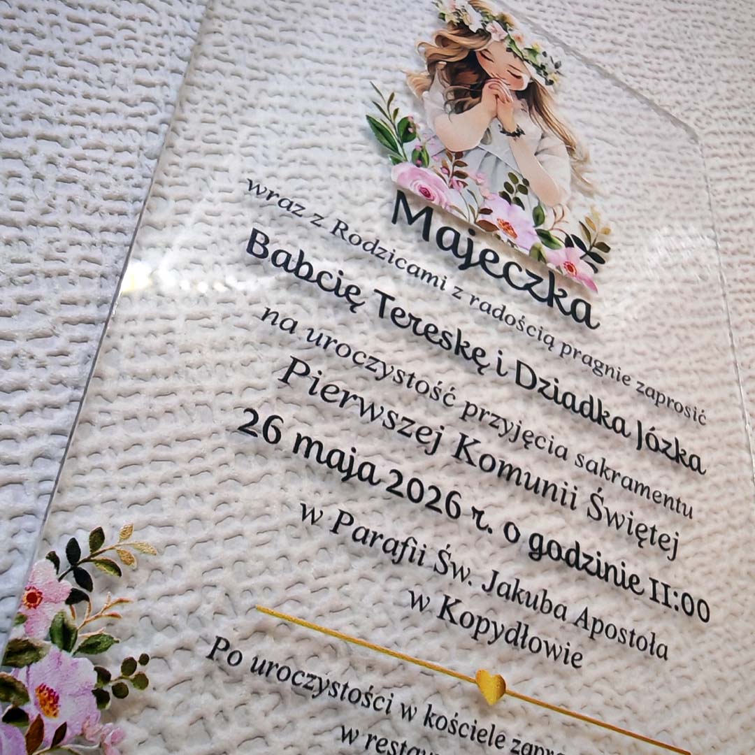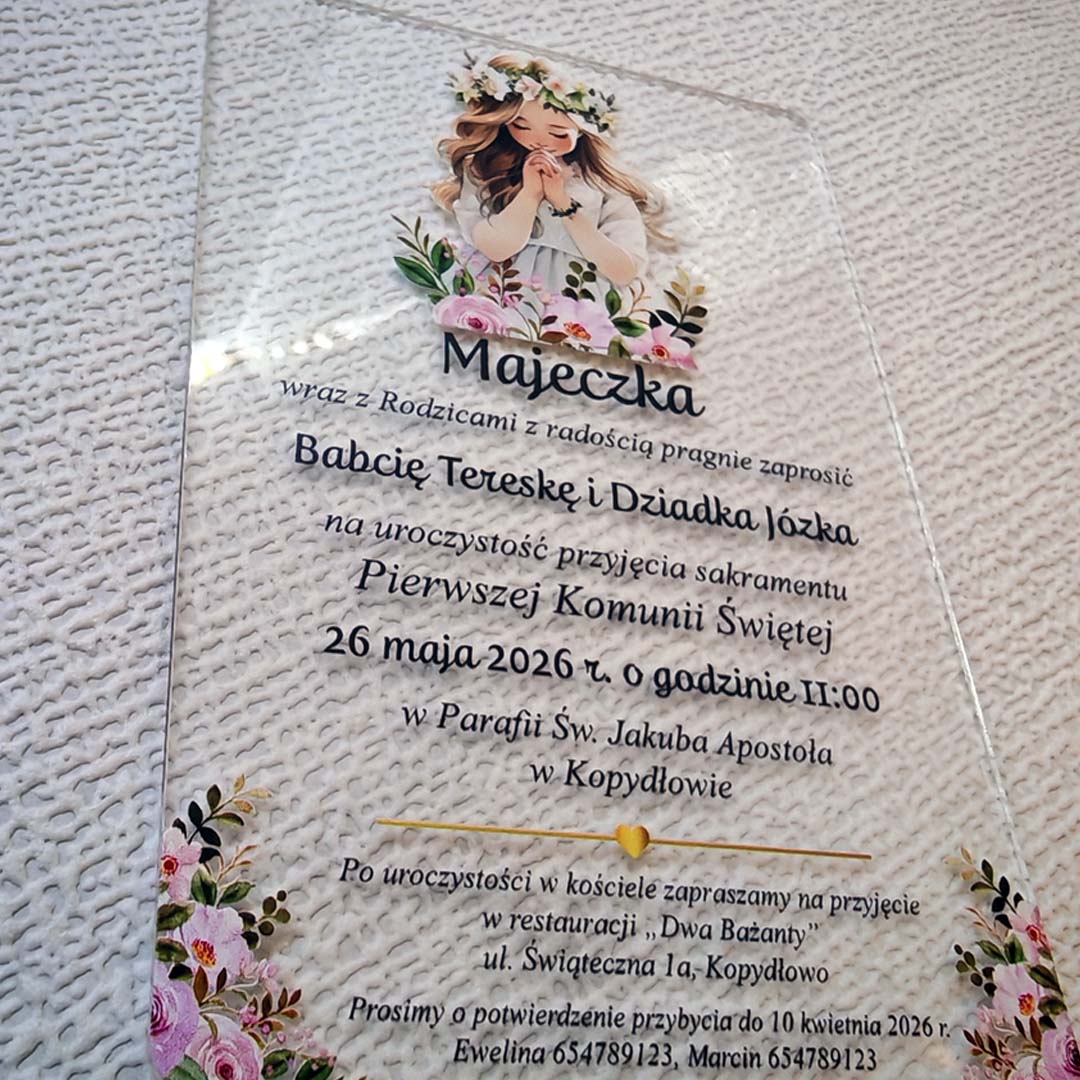 Zaproszenia na komunię na szkle akrylowym (plexi) to nowoczesna forma i zarazem pamiątka na długie lata. Nasze zaproszenia mają rozmiar 10x15 i do każdego dołączona jest koperta do wyboru GRATIS!