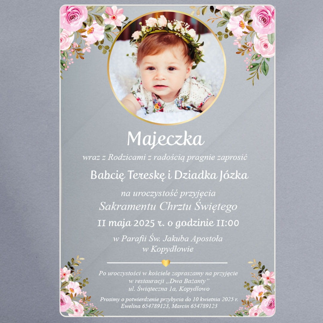 Zaproszenie na chrzest święty ze zdjęciem dla dziewczynki na szkle akrylowym róż