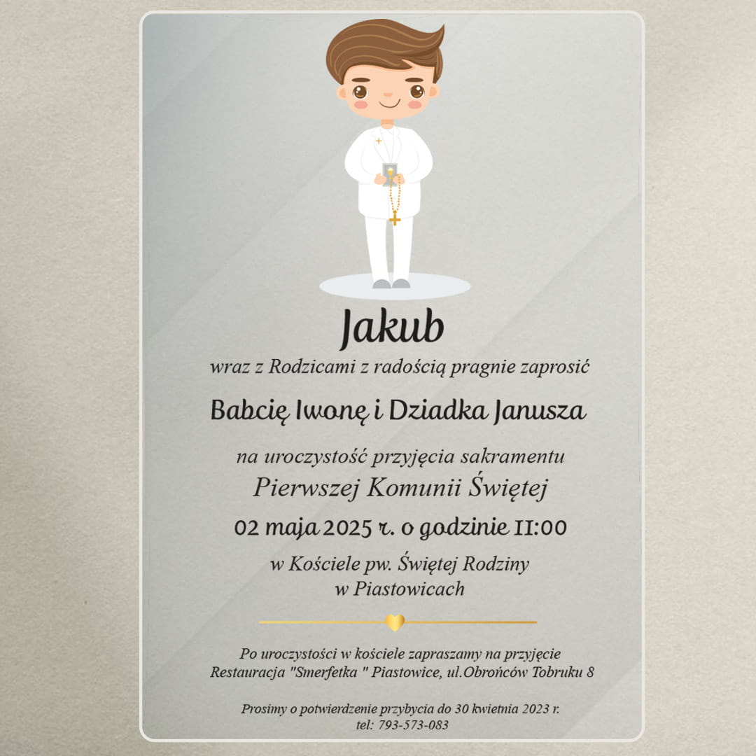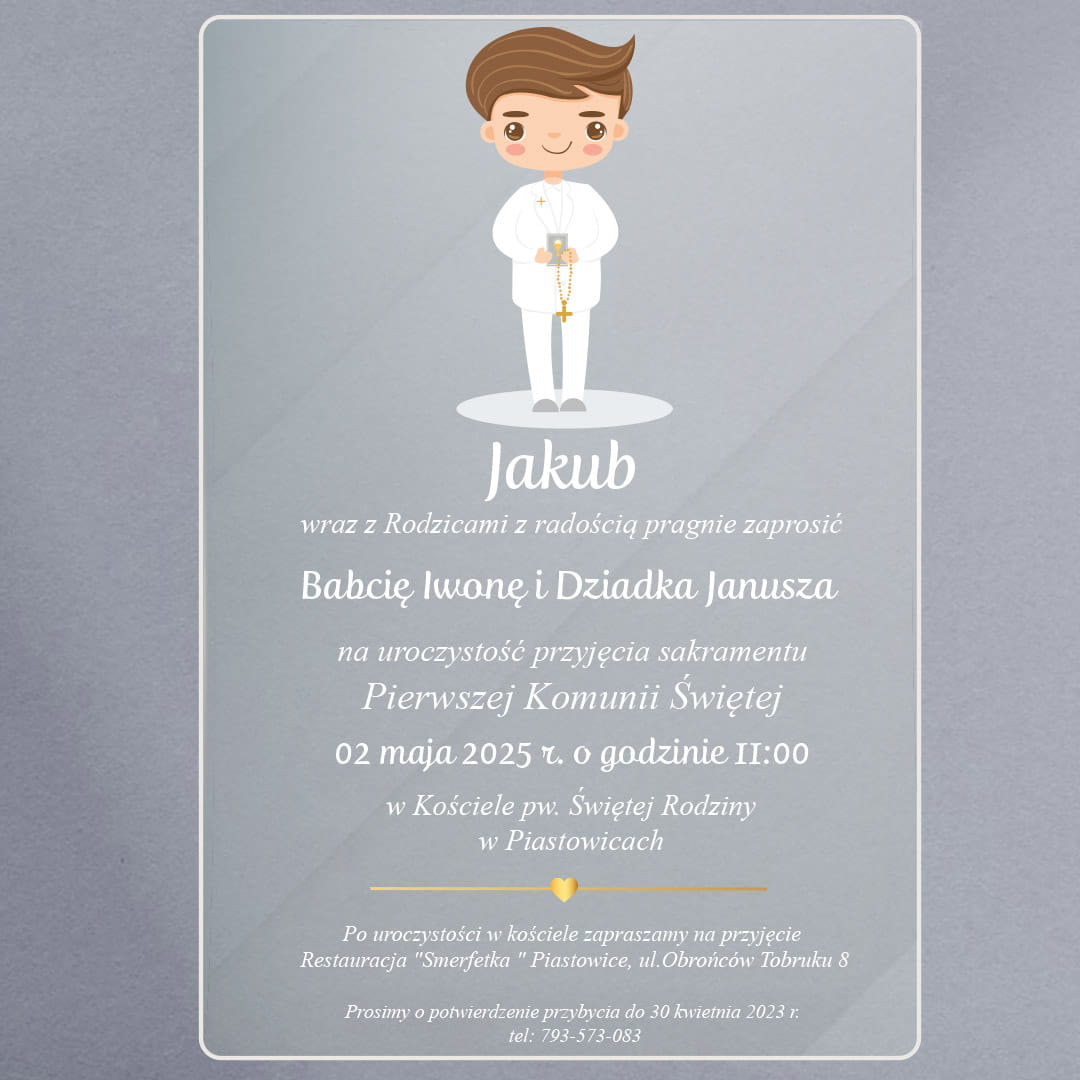 Zaproszenie na komunię na szkle akrylowym - chłopiec w albie