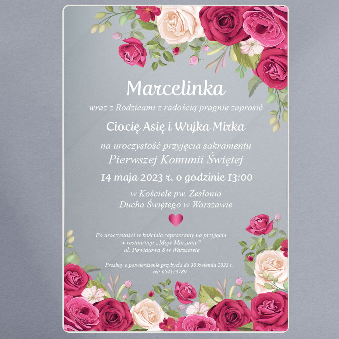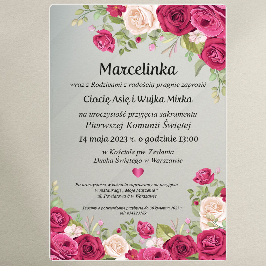 Zaproszenie na komunię na szkle akrylowym - róże
