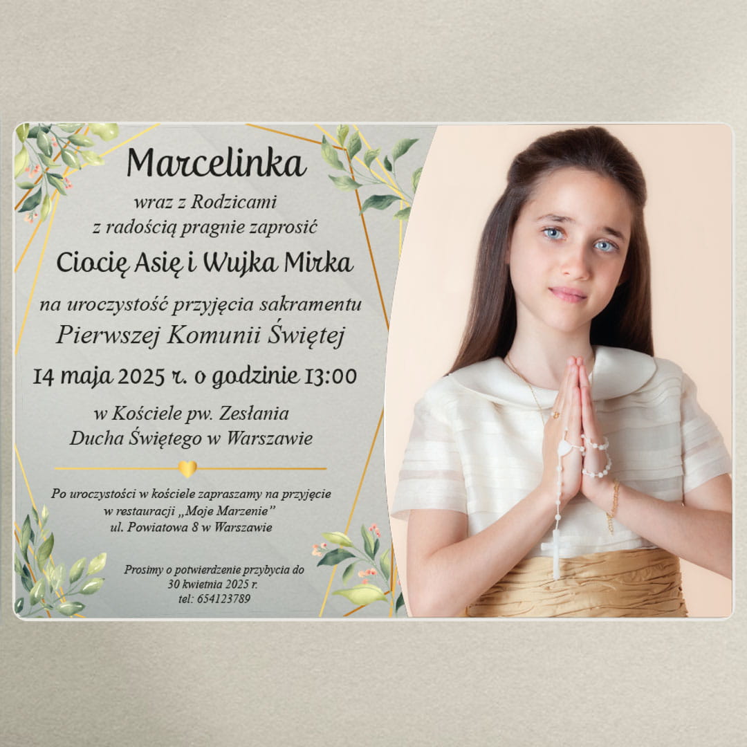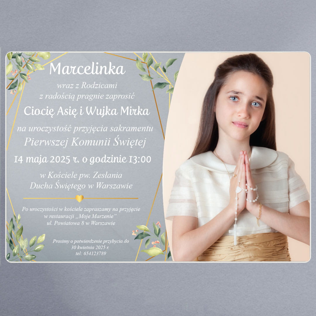 Zaproszenie na komunię ze zdjęciem dla dziewczynki na szkle akrylowym