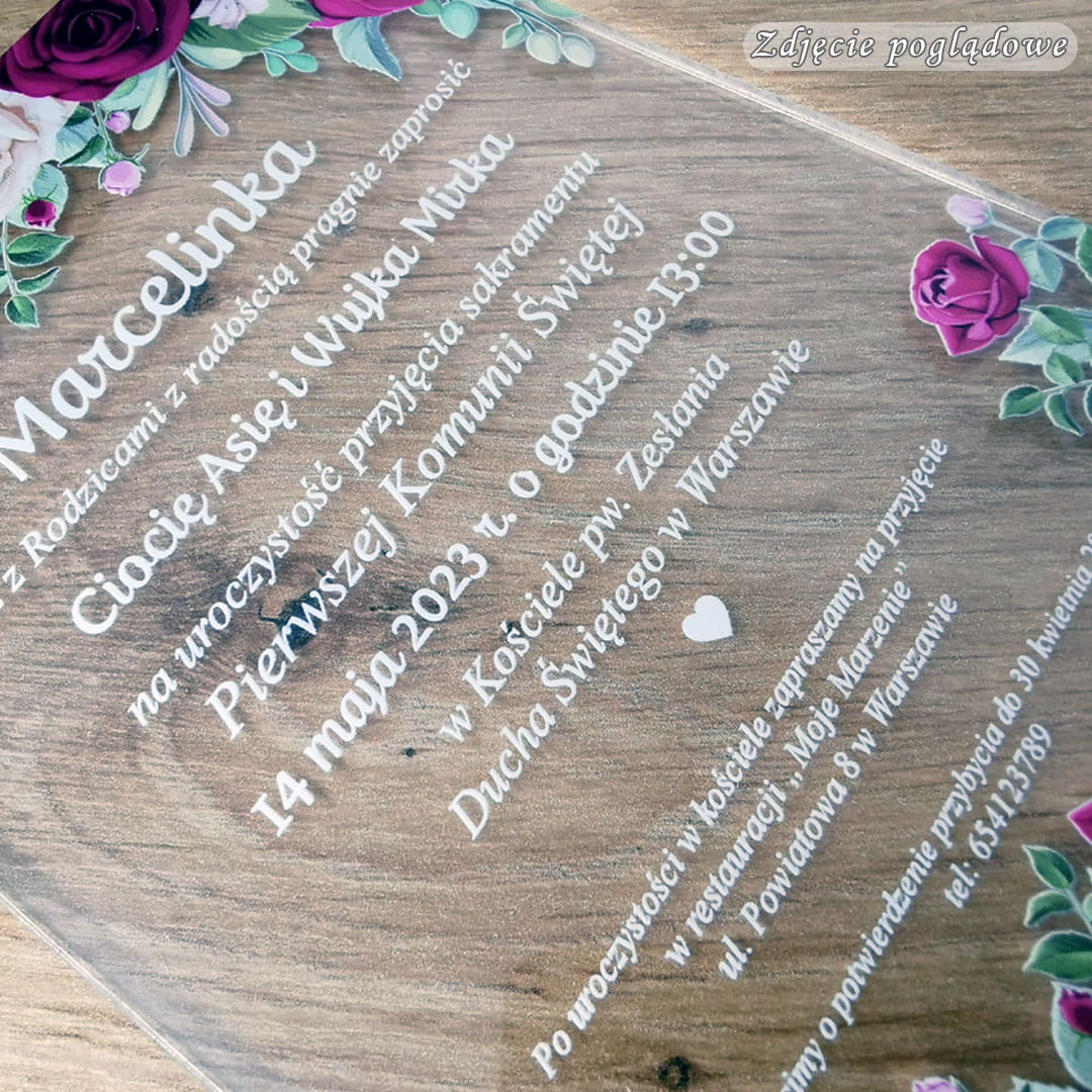 Zaproszenie na komunię ze zdjęciem dla dziewczynki na szkle akrylowym